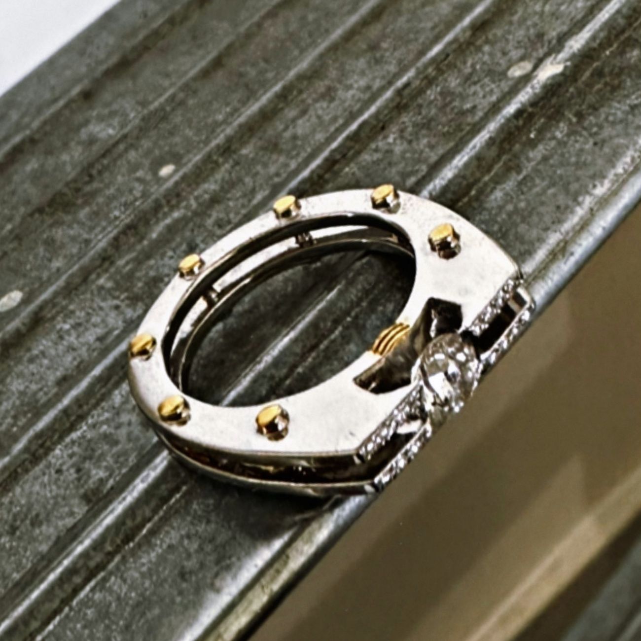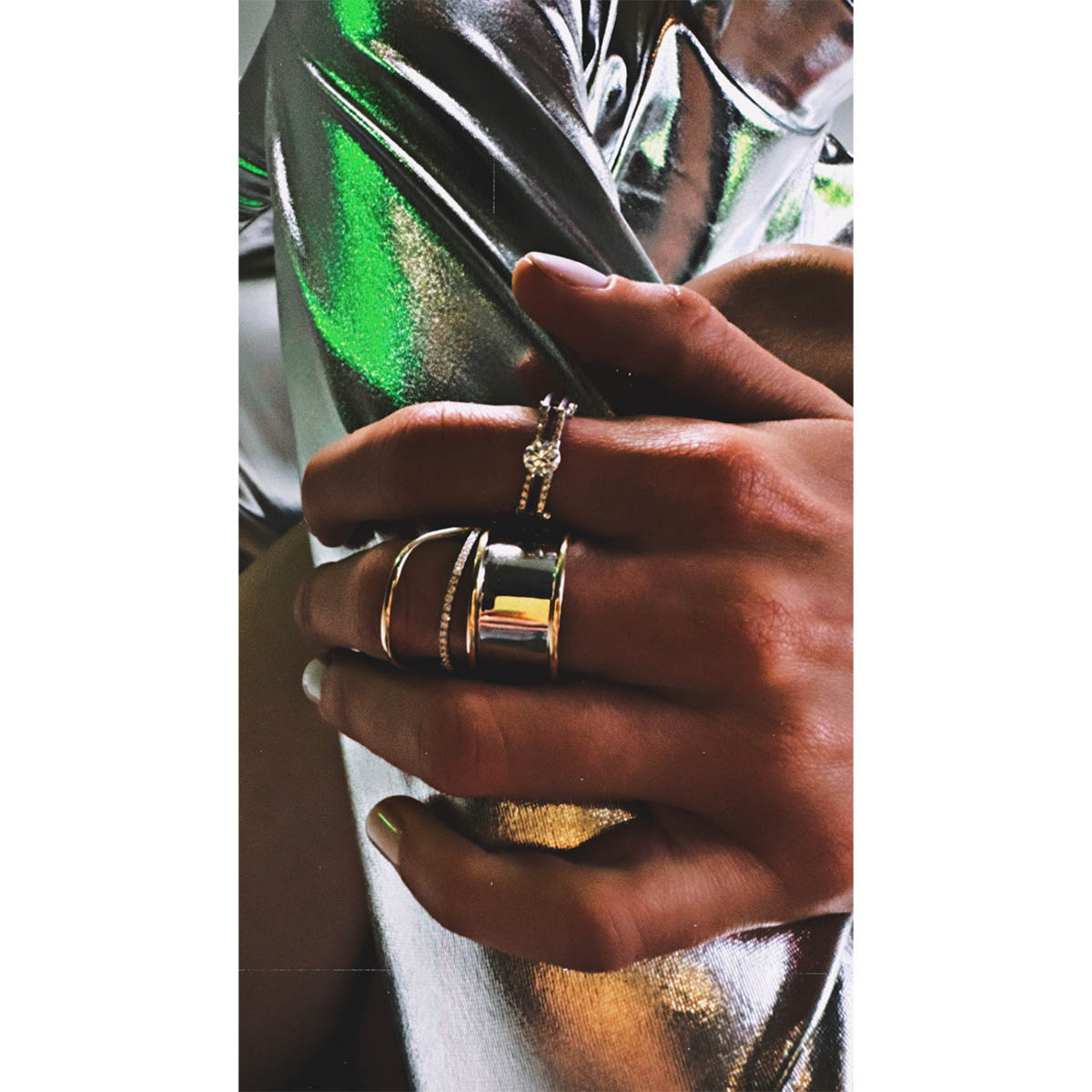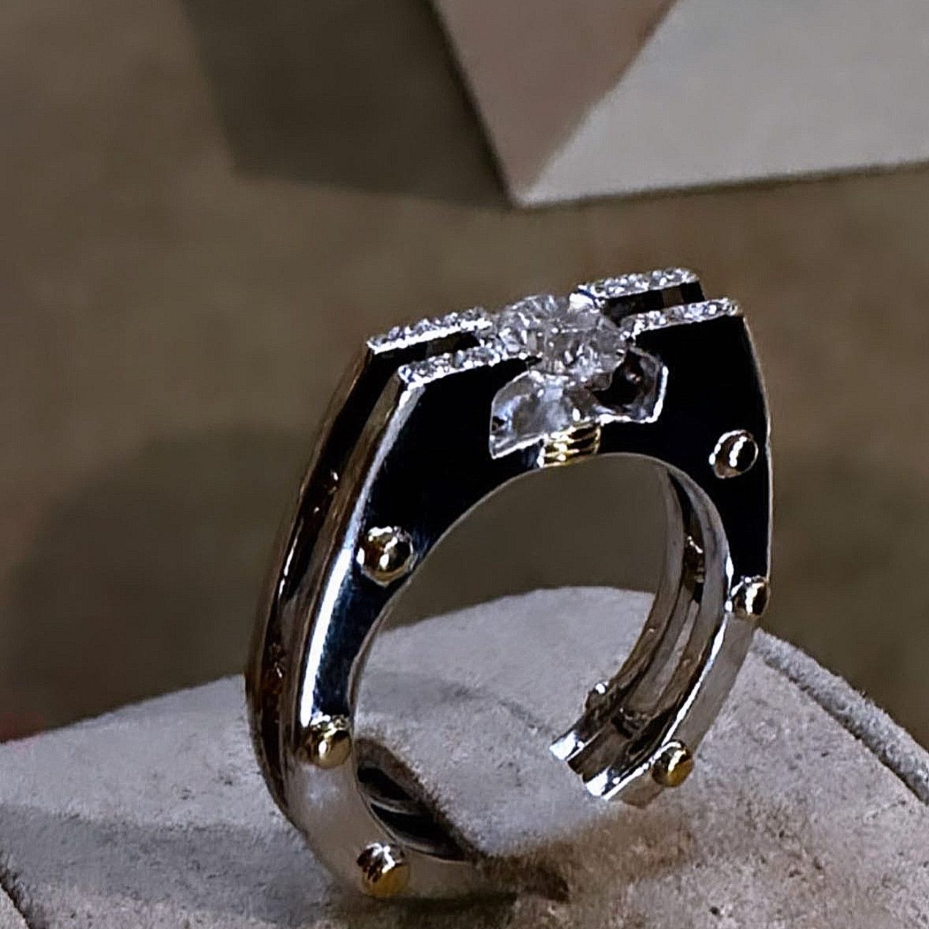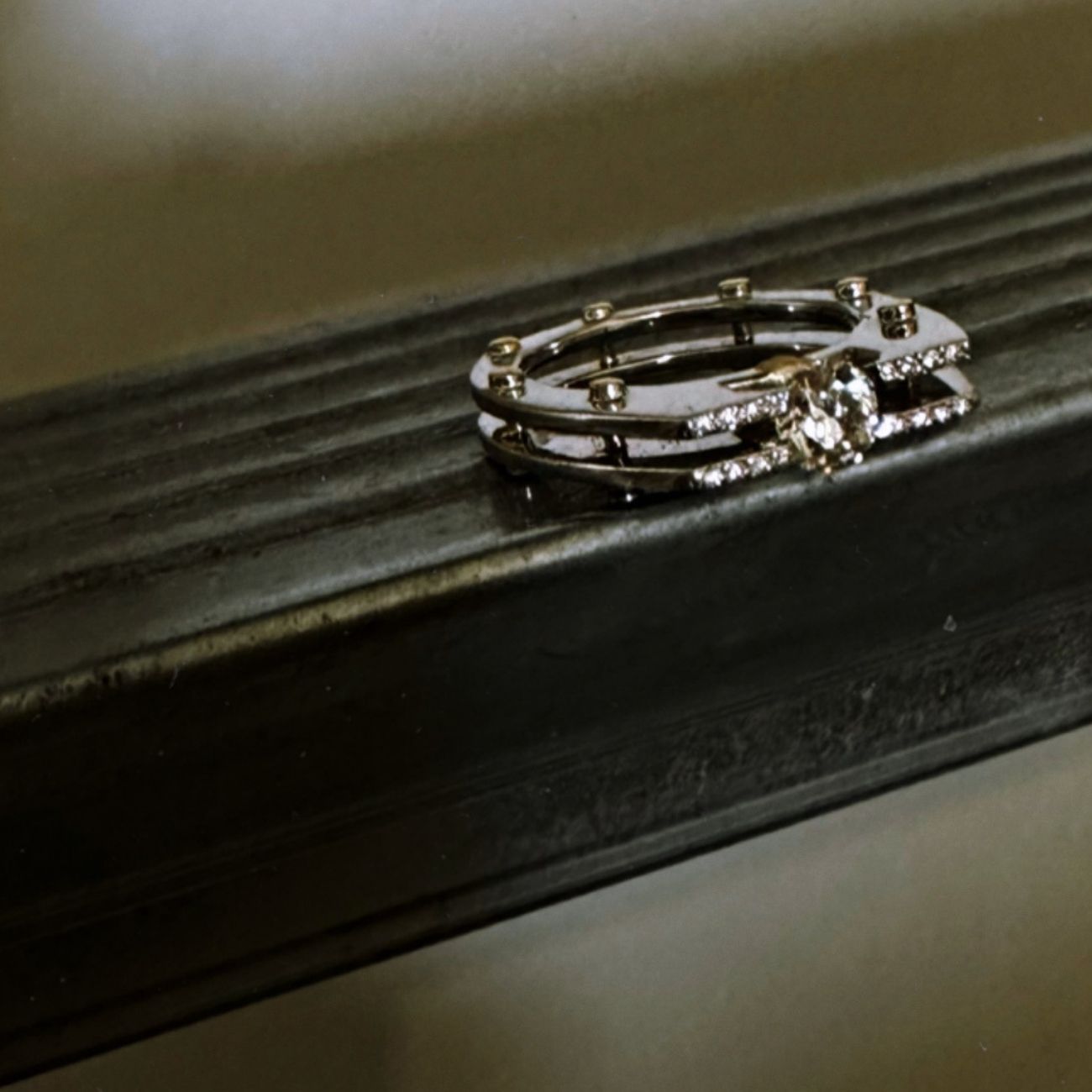 La bague emblématique Cyborg reflète l’esthétique futuriste et avant-gardiste des cyborgs, ces êtres mi-humains mi-robots. L’aspect géométrique et la forme mélangés aux diamants représentent l’originalité et la beauté de RK.