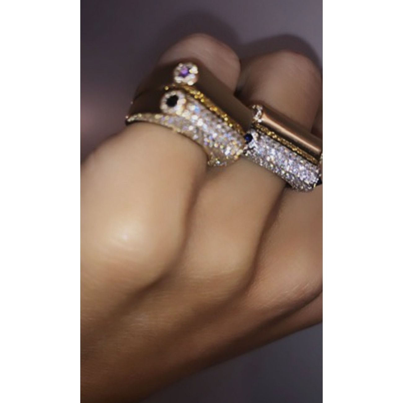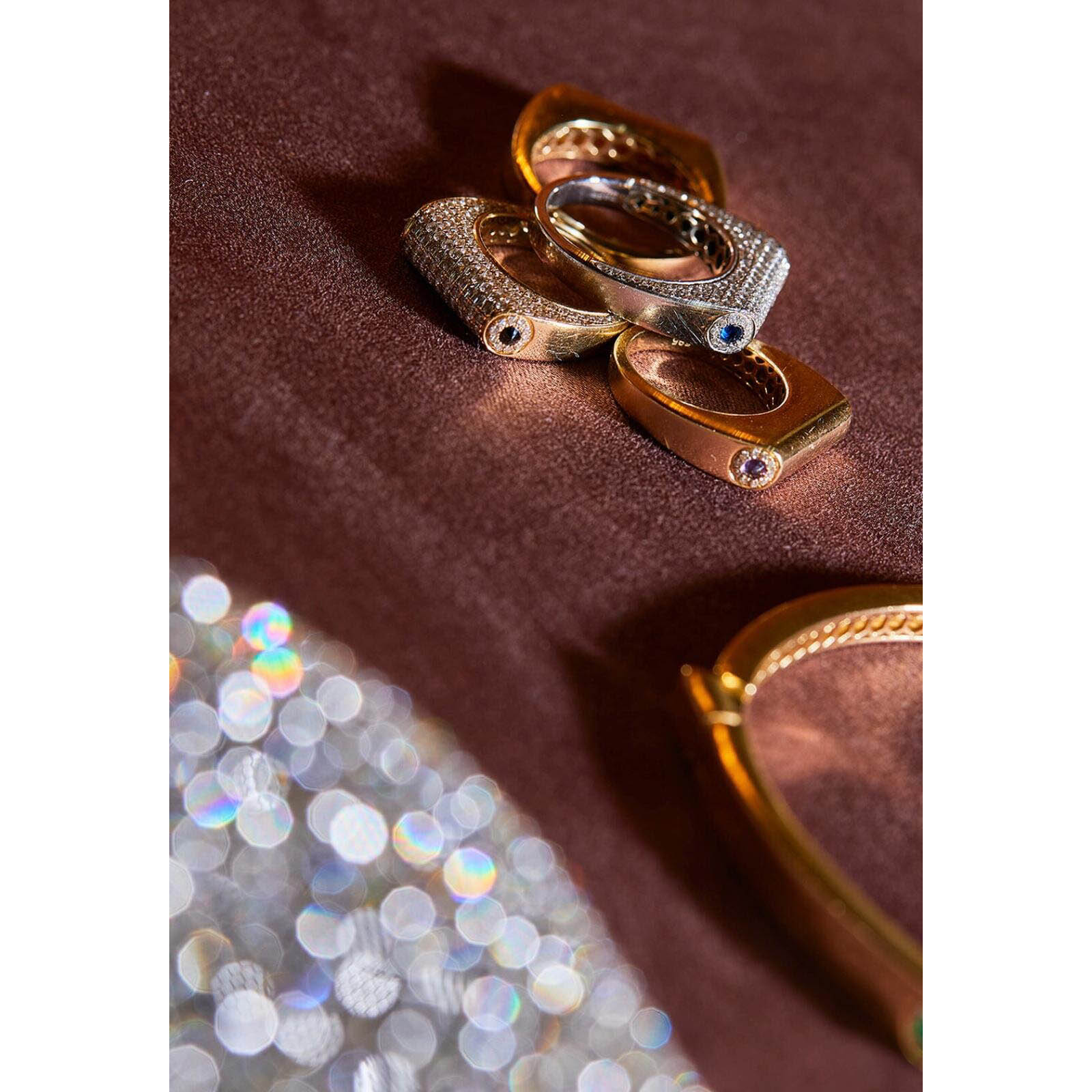 Les créations de Rainbow K, comme la bague Grace, allient style rétro et glamour contemporain. Ce modèle est réalisé en or 14 carats avec d’éblouissants diamants sertis en pavé et rehaussé de deux pierres précieuses taille en pointe.