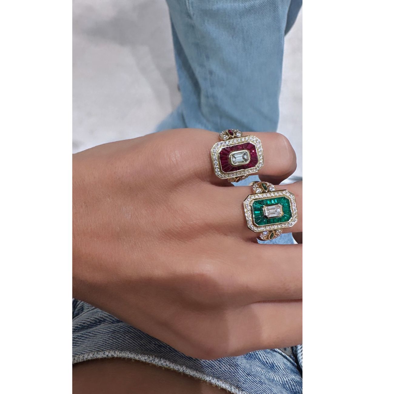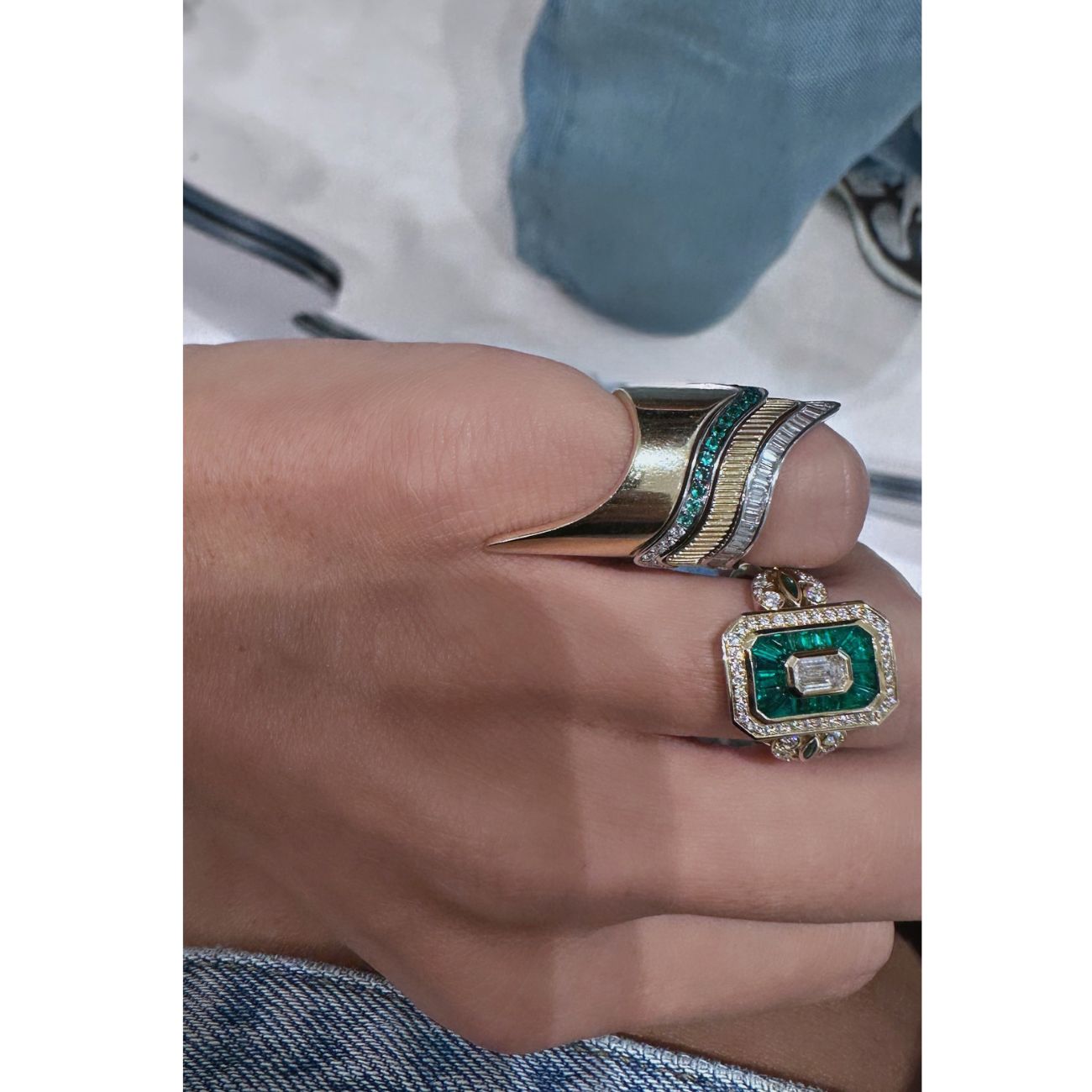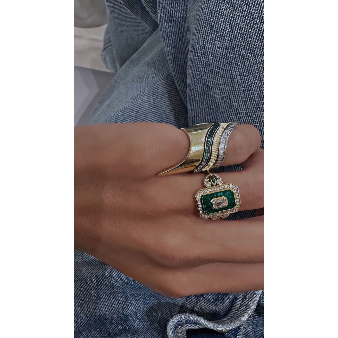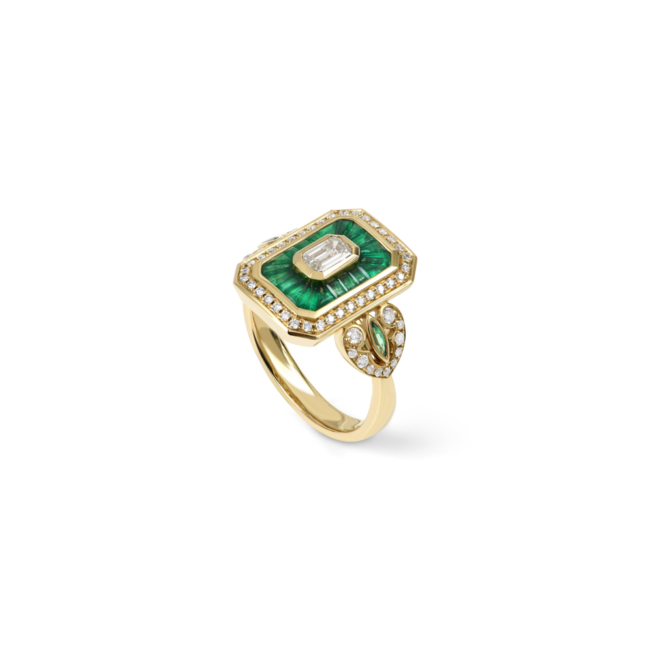Cette bague Royale en or 14 carats signée Rainbow K représente l’ADN des fondatrices de la marque, Kelly Souied et Kelia Toledano, pour le mouvement Art déco des années 1920. Émeraudes et diamants blancs s’entremêlent pour une bague au design unique.