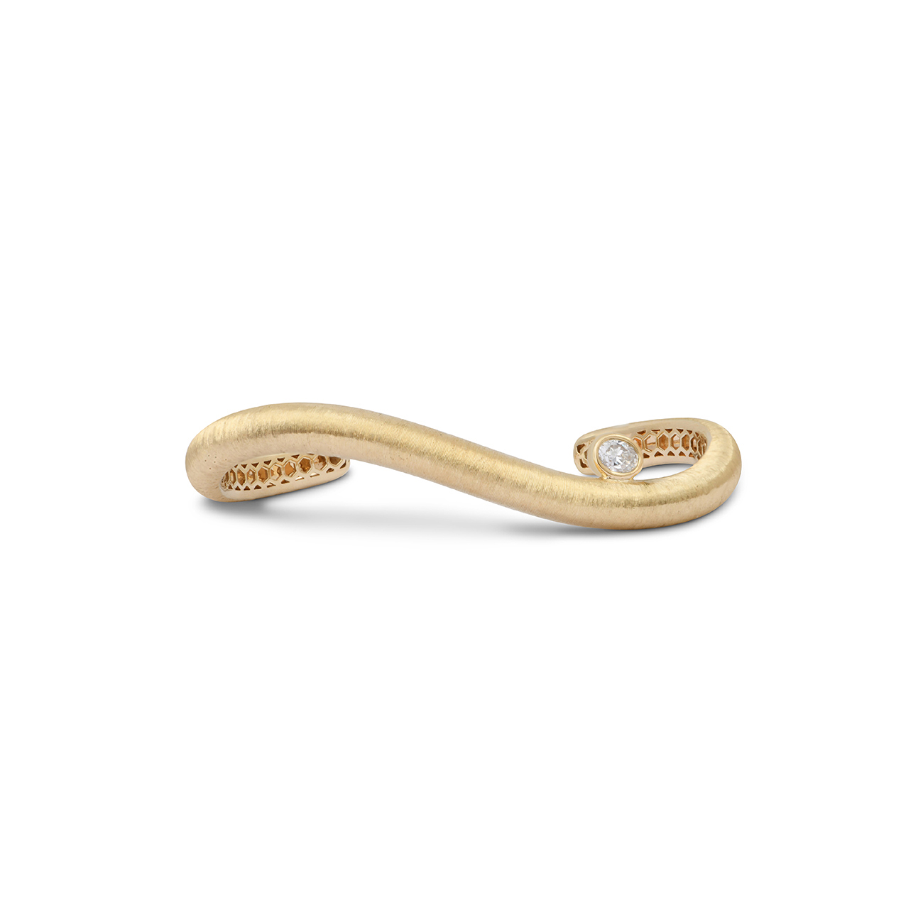 • L’or brossé, travaillé selon les plus hauts standards de la haute joaillerie pour obtenir un fini satiné, sublimé par un diamant flottant.