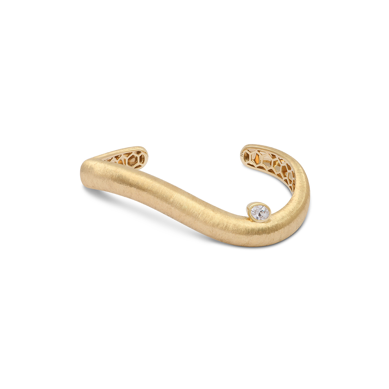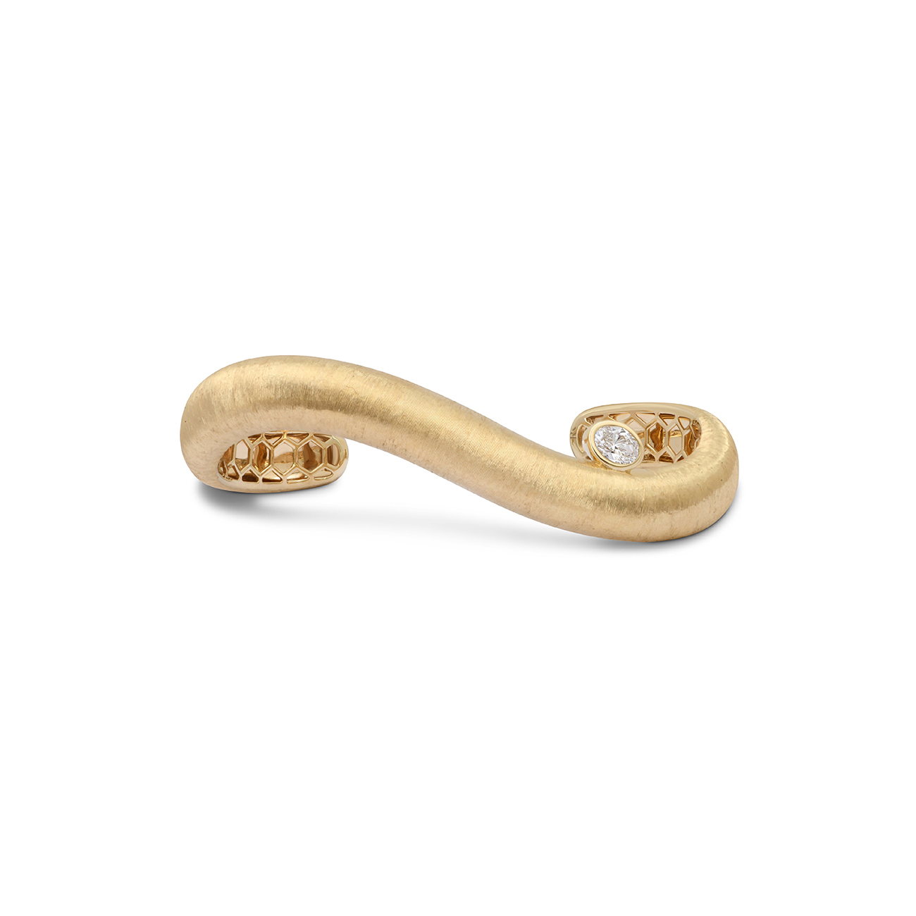 • L’or brossé, travaillé selon les plus hauts standards de la haute joaillerie pour obtenir un fini satiné, sublimé par un diamant flottant.