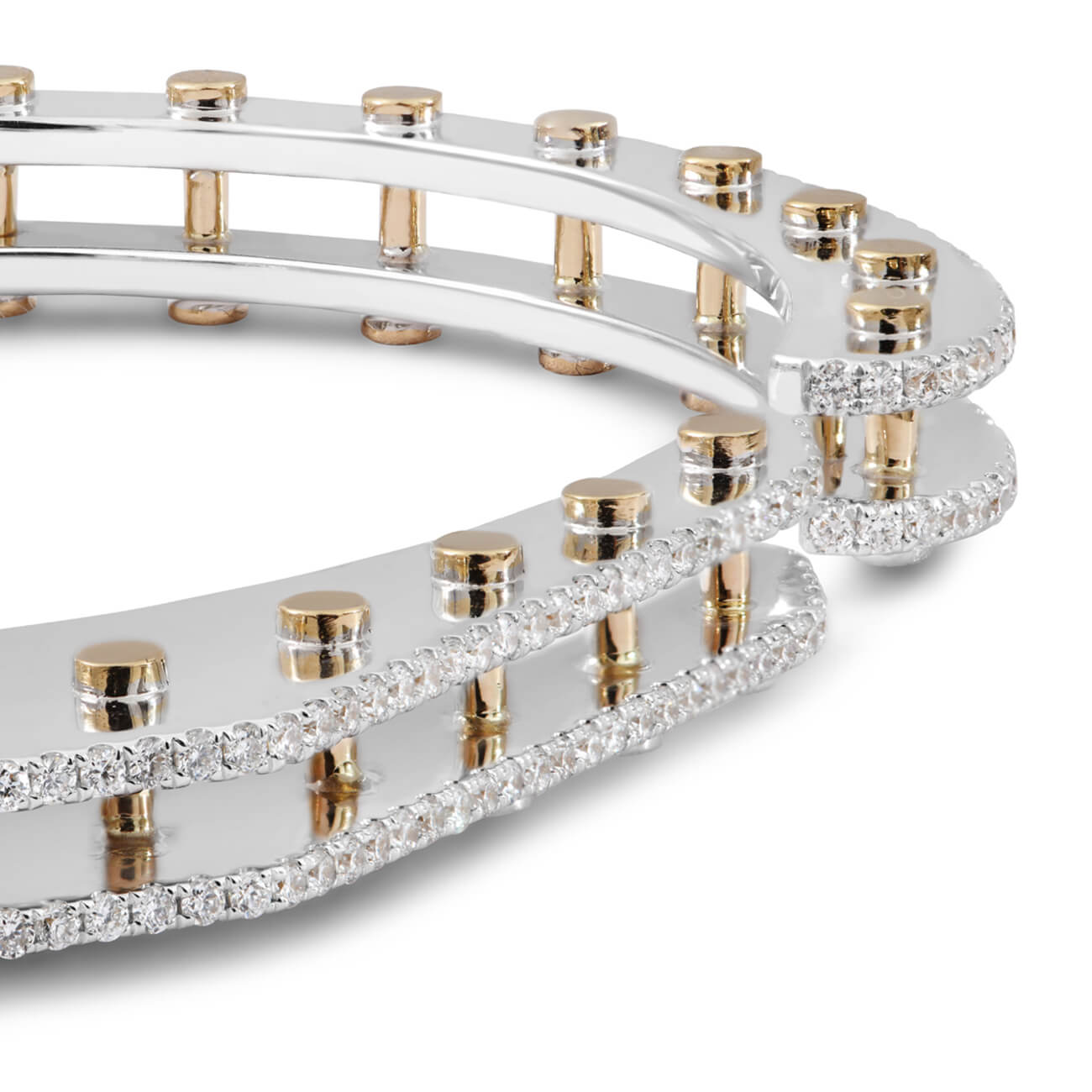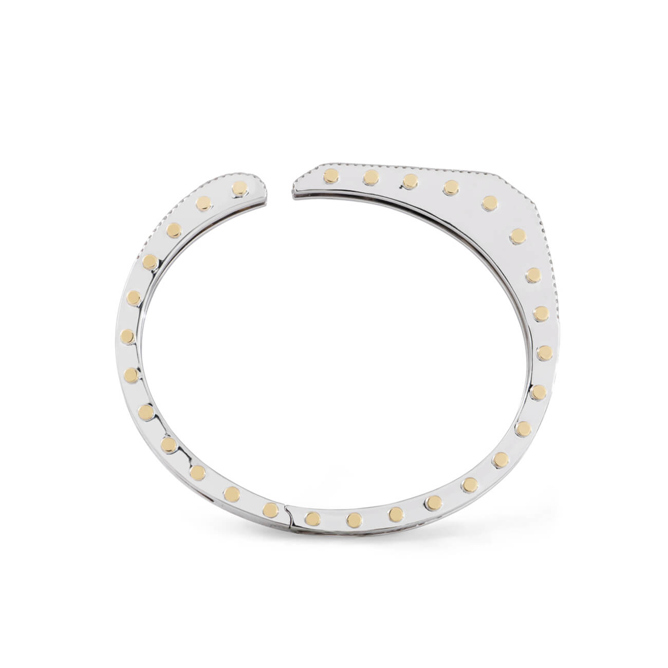 Le bracelet emblématique Cyborg reflète l’esthétique futuriste et avant-gardiste des cyborgs, ces êtres mi-humains mi-robots. L’aspect géométrique et la forme mélangés aux diamants représentent l’originalité et la beauté de RK.
