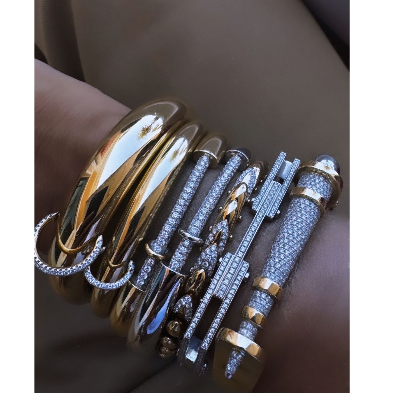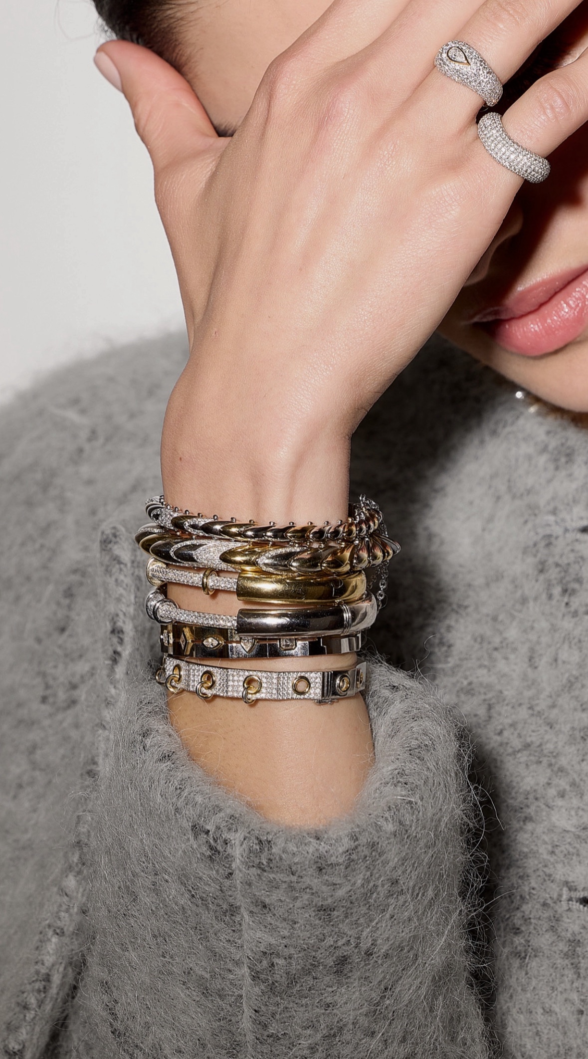 Le bracelet Ecailles est une pièce d’exception, elle représente tous les codes de RK. Une pièce de haute joaillerie, délicate dans son mouvement, les écailles s’articulent entre elles pour un design fort. Elle s’adapte à tous les looks, du classique au plus flamboyant.