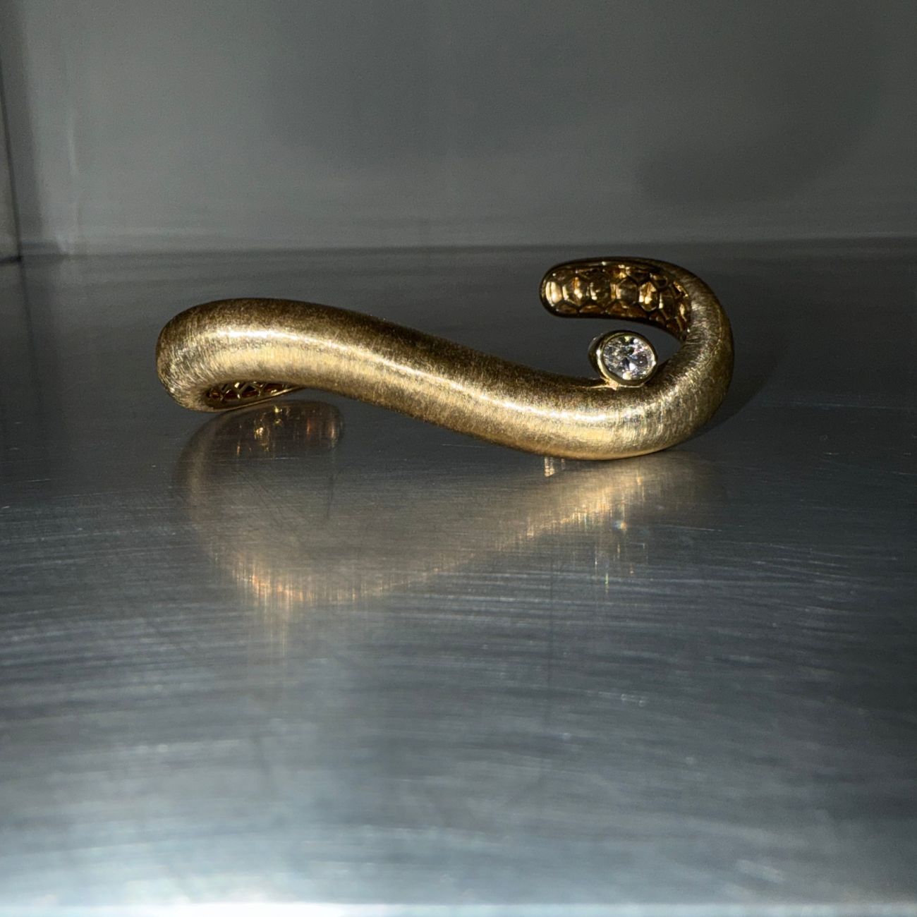 • L’or brossé, travaillé selon les plus hauts standards de la haute joaillerie pour obtenir un fini satiné, sublimé par un diamant flottant.
