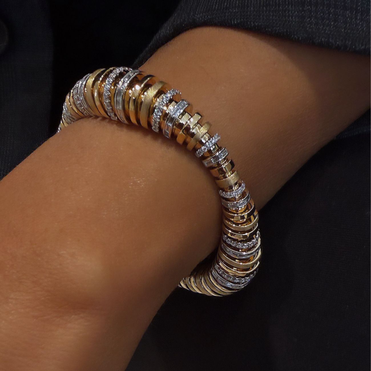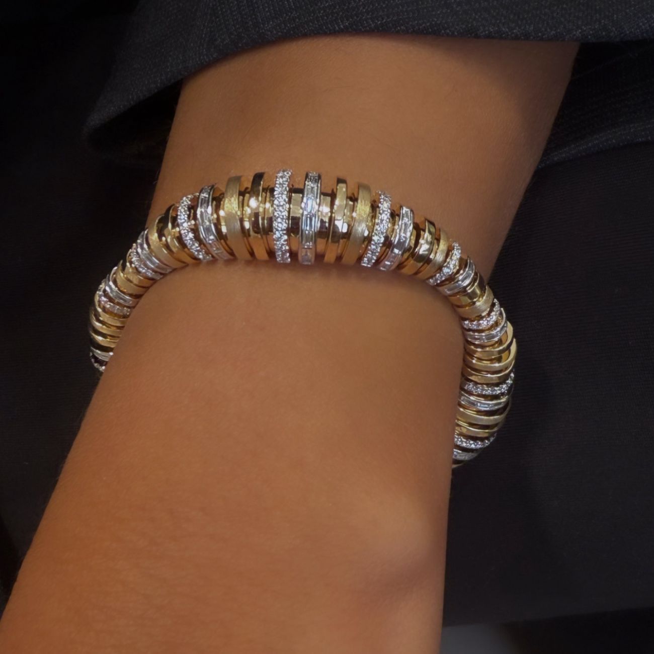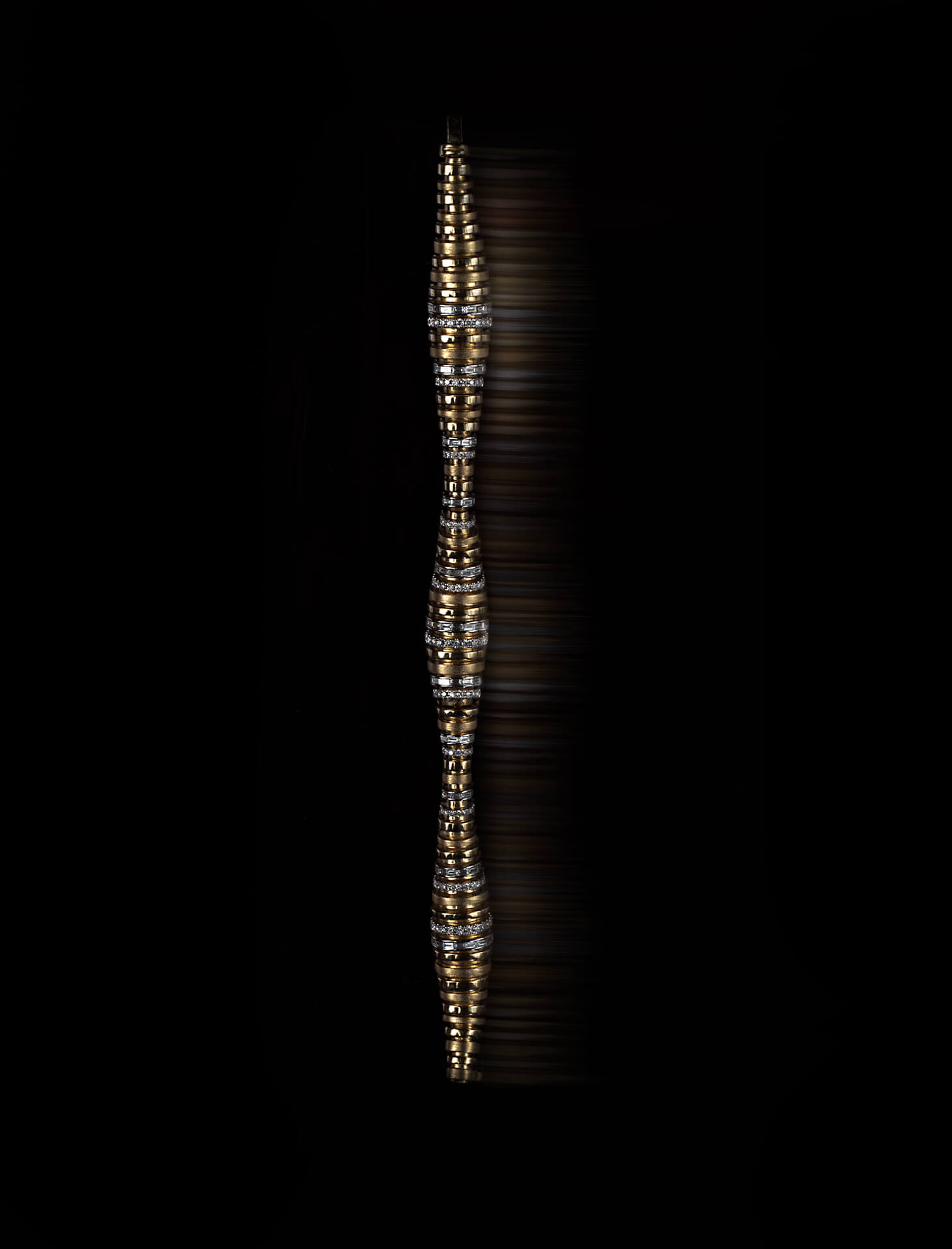 Une source d’inspiration pour le bracelet TOURBILLON. Une pièce sculptée comme un mouvement, à la fois architecturale et d’une fluidité hypnotique. Une ligne de haute joaillerie géométrique façonnée par d’élégantes courbes, mêlant l’éclat de l’or, la pureté des diamants et la précision des sertissages baguette.
