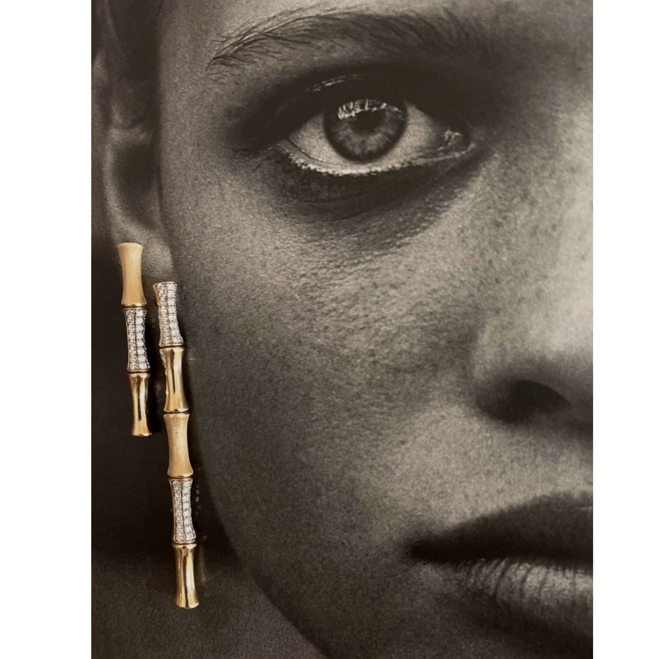 The “Bamboo” earring is light and comfortable to wear. Perfect for an accumulation of earrings by playing with the different sizes. It reflects the brand’s visionary approach. Drawing inspiration from nature, it’s made from 14K gold with a brushed and polished finish, and studded with shimmery pavé-set diamonds.