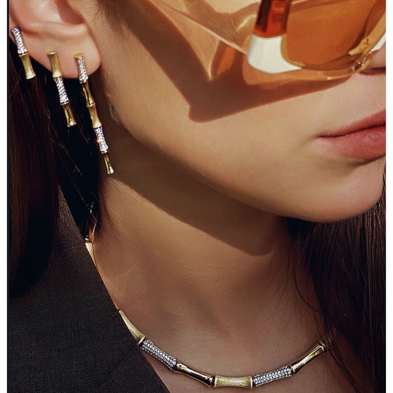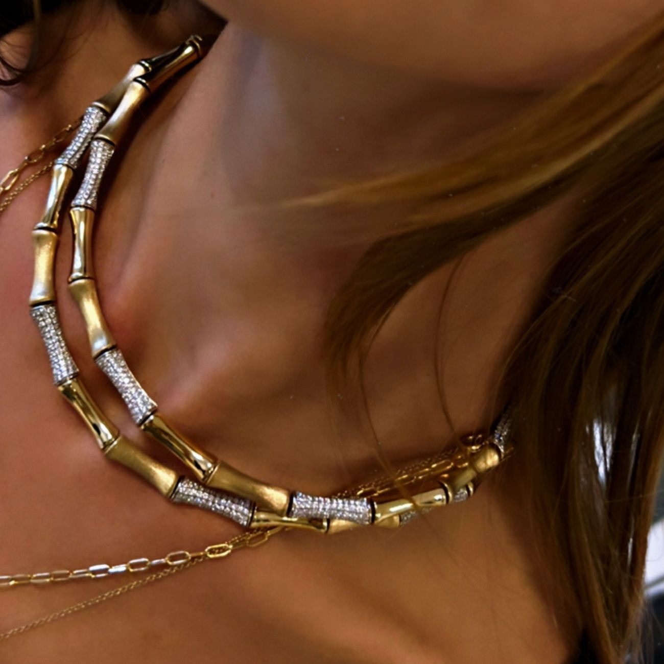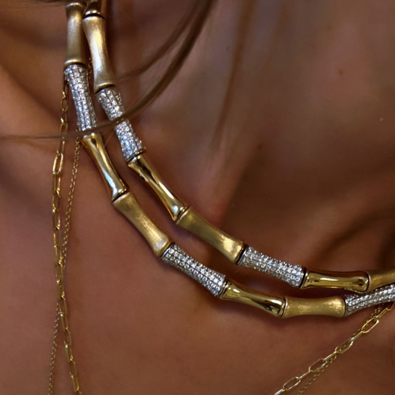 The “Bamboo” necklace is a unique and iconic piece from Rainbow K. The vintage design of this necklace brings a touch of retro charm and elegance to your look. It reflects the brand’s visionary approach. Drawing inspiration from nature, it’s made from 14K gold with a brushed and polished finish, and studded with shimmery pavé-set diamonds.