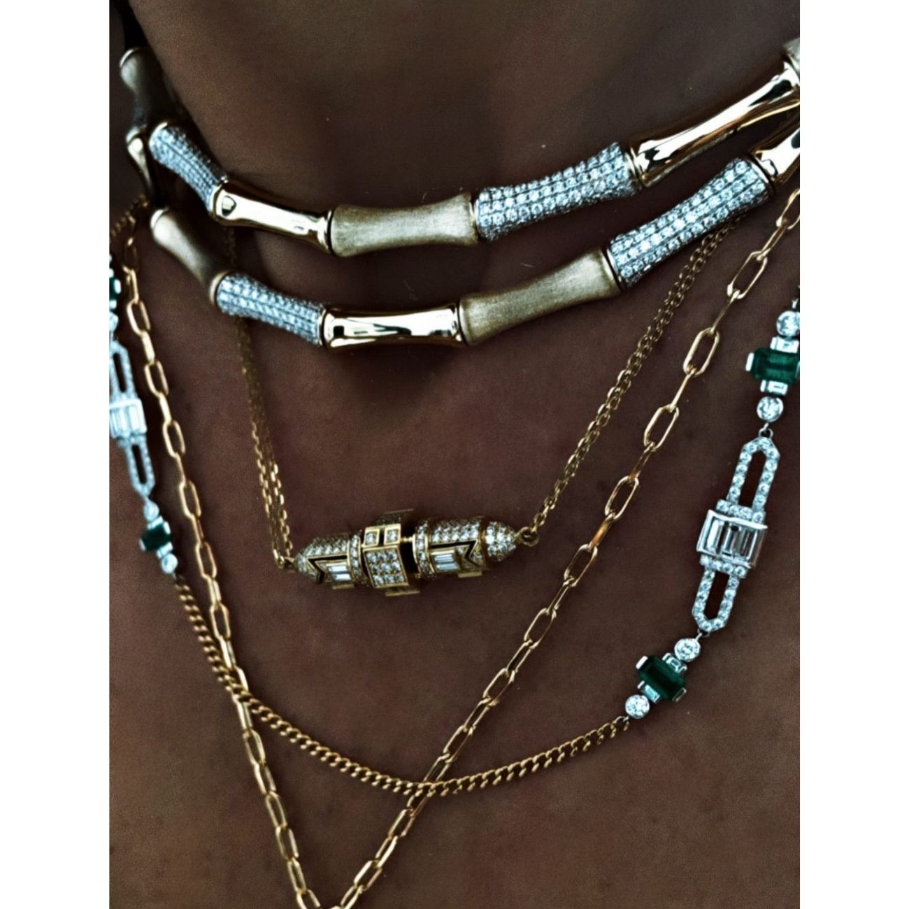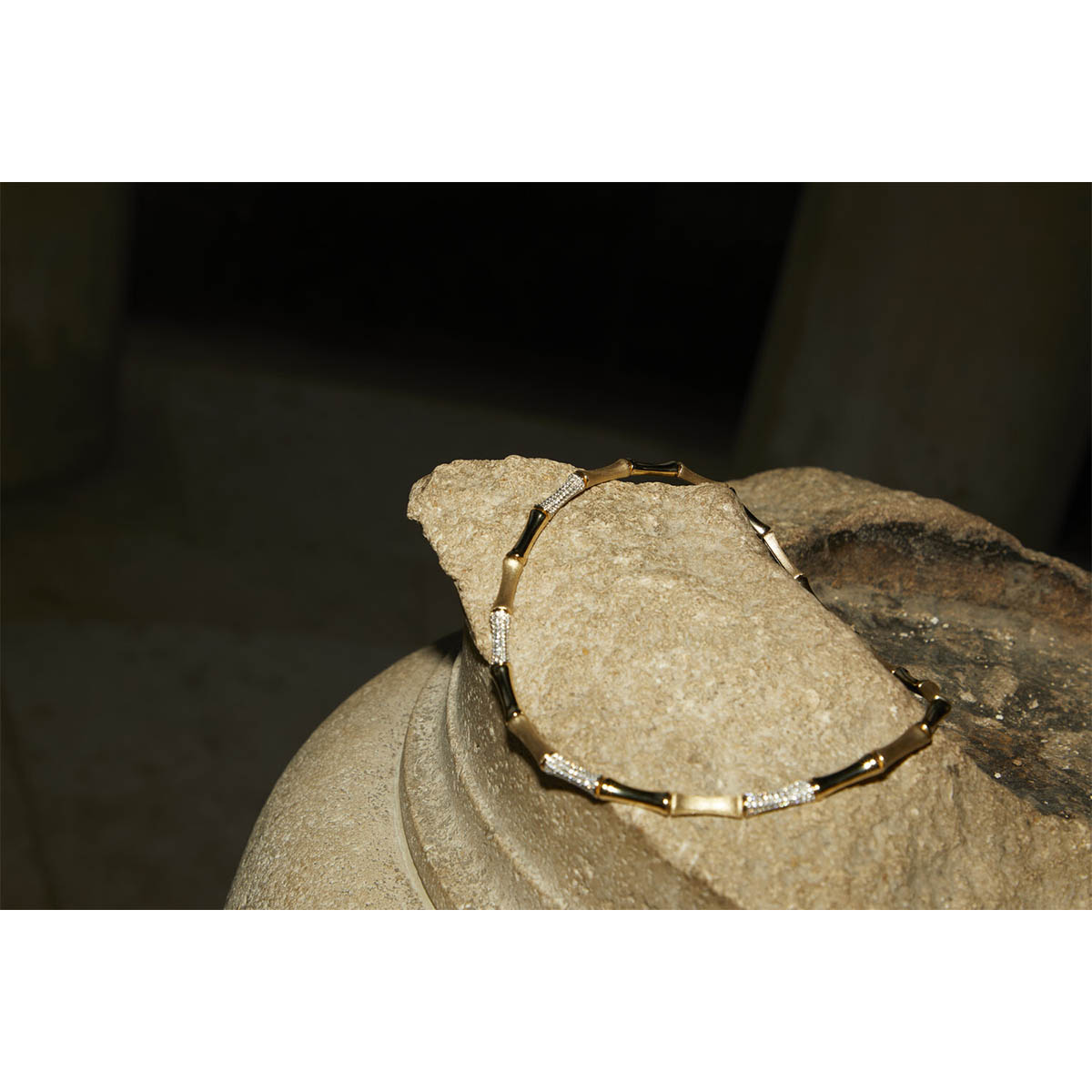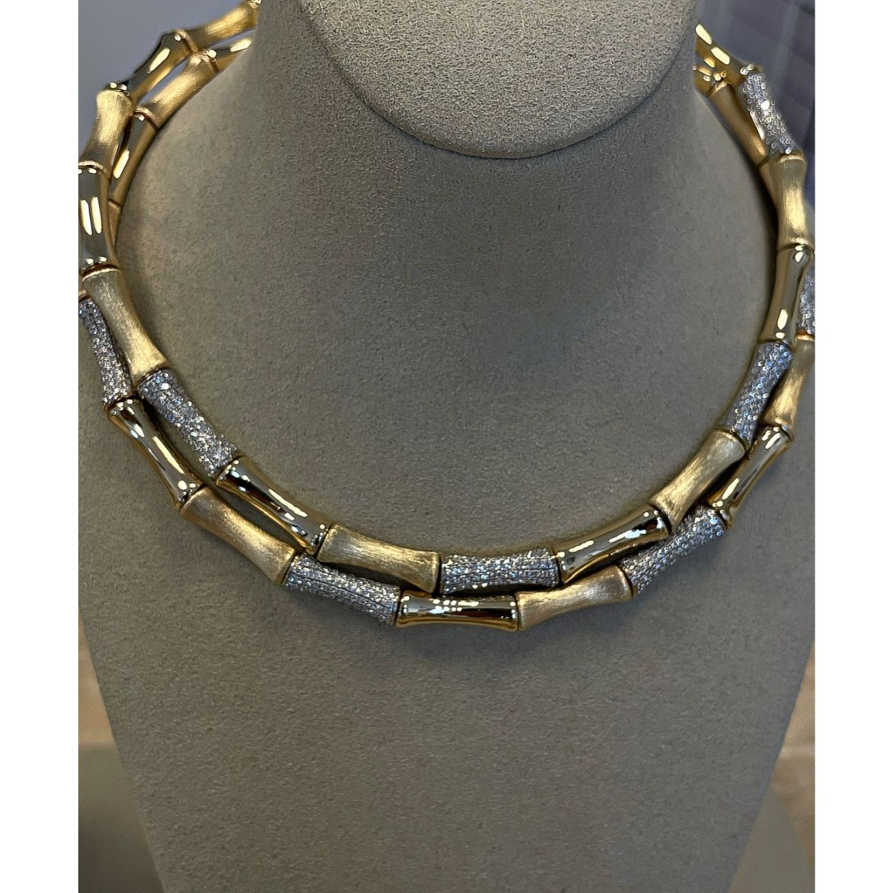 The “Bamboo” necklace is a unique and iconic piece from Rainbow K. The vintage design of this necklace brings a touch of retro charm and elegance to your look. It reflects the brand’s visionary approach. Drawing inspiration from nature, it’s made from 14K gold with a brushed and polished finish, and studded with shimmery pavé-set diamonds.