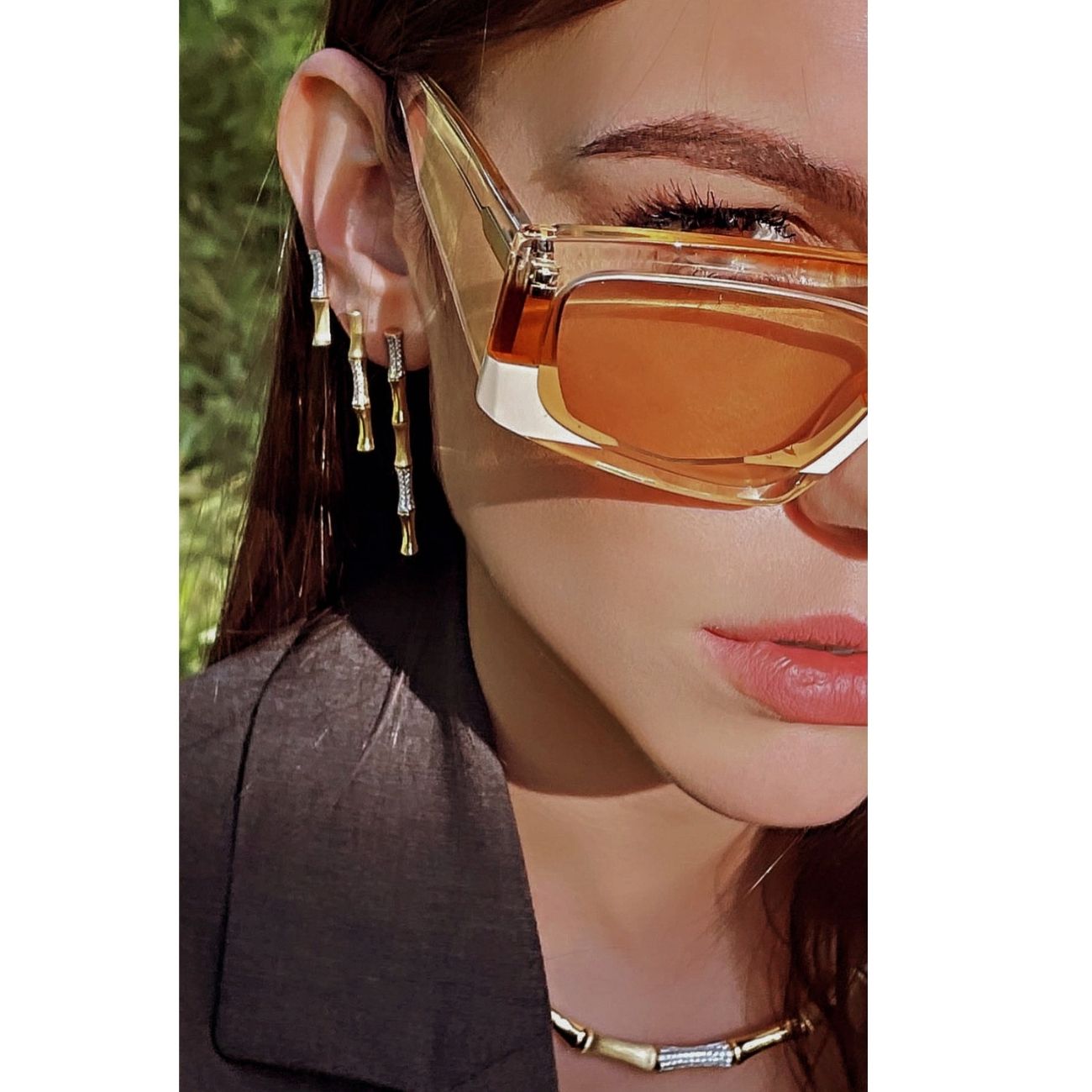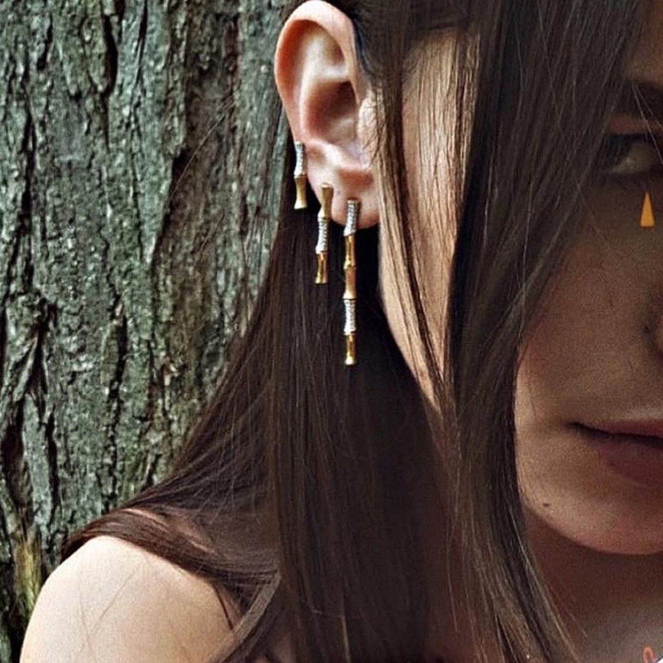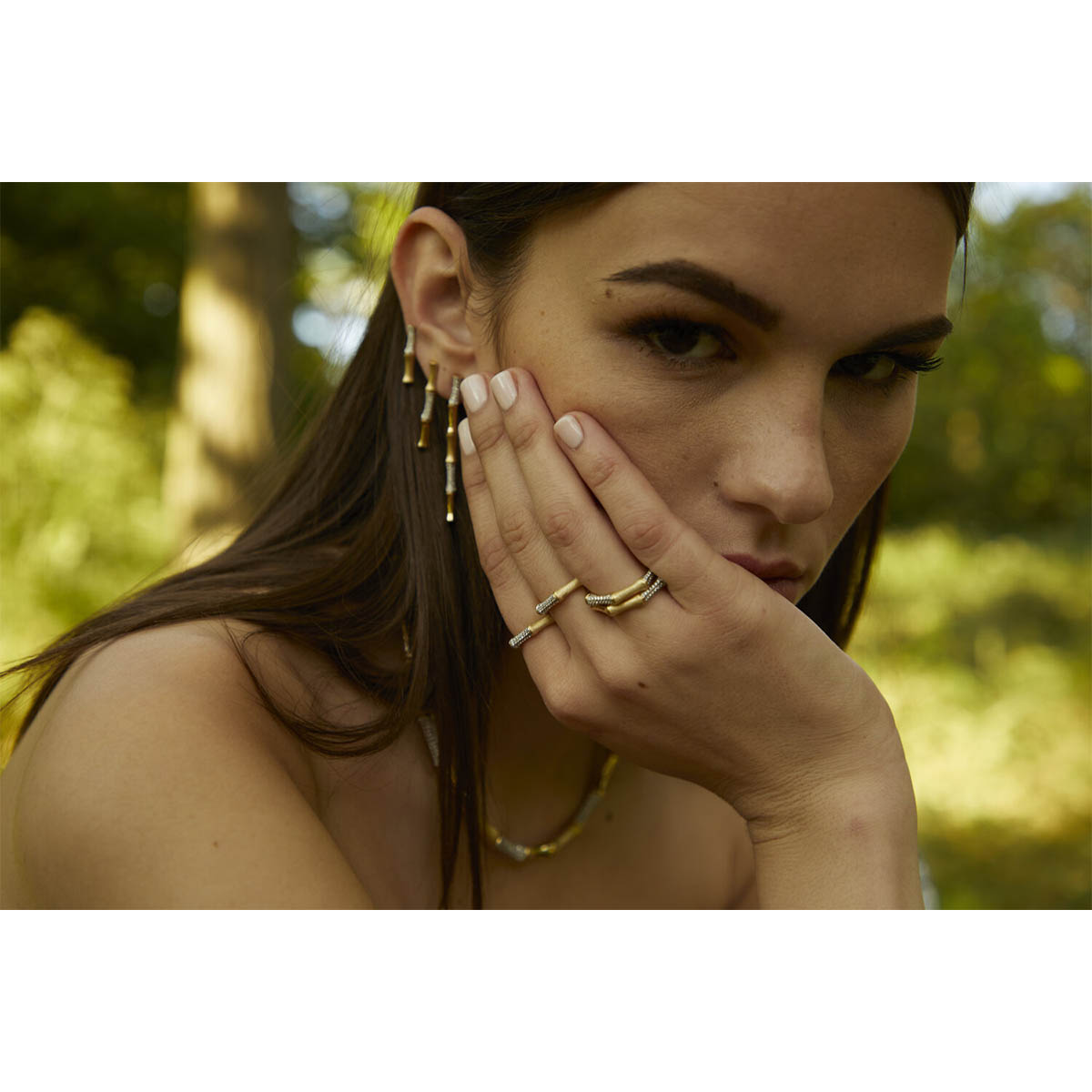 The “Bamboo” earring is light and comfortable to wear. Perfect for an accumulation of earrings by playing with the different sizes. It reflects the brand’s visionary approach. Drawing inspiration from nature, it’s made from 14K gold and studded with shimmery pavé-set diamonds.