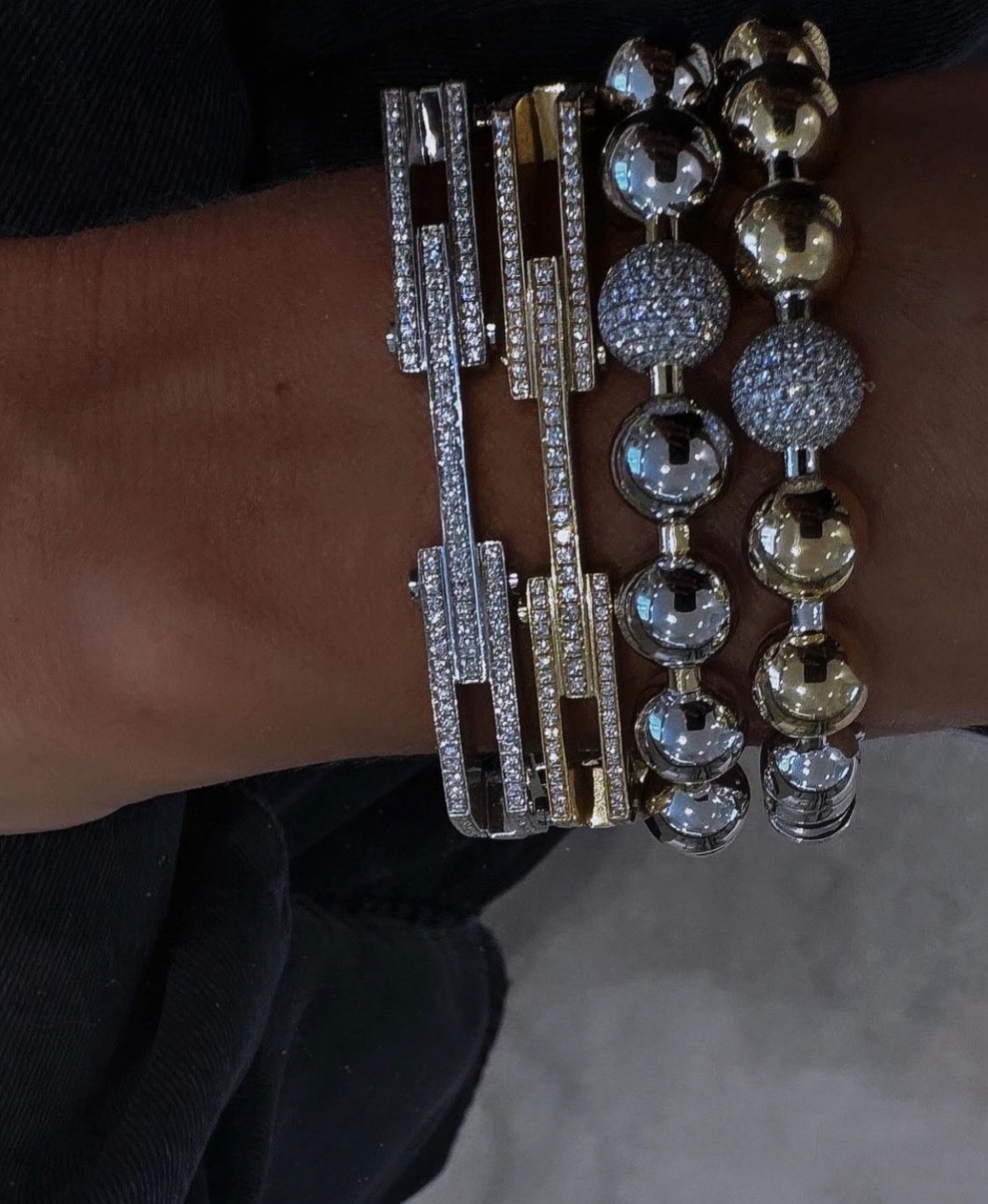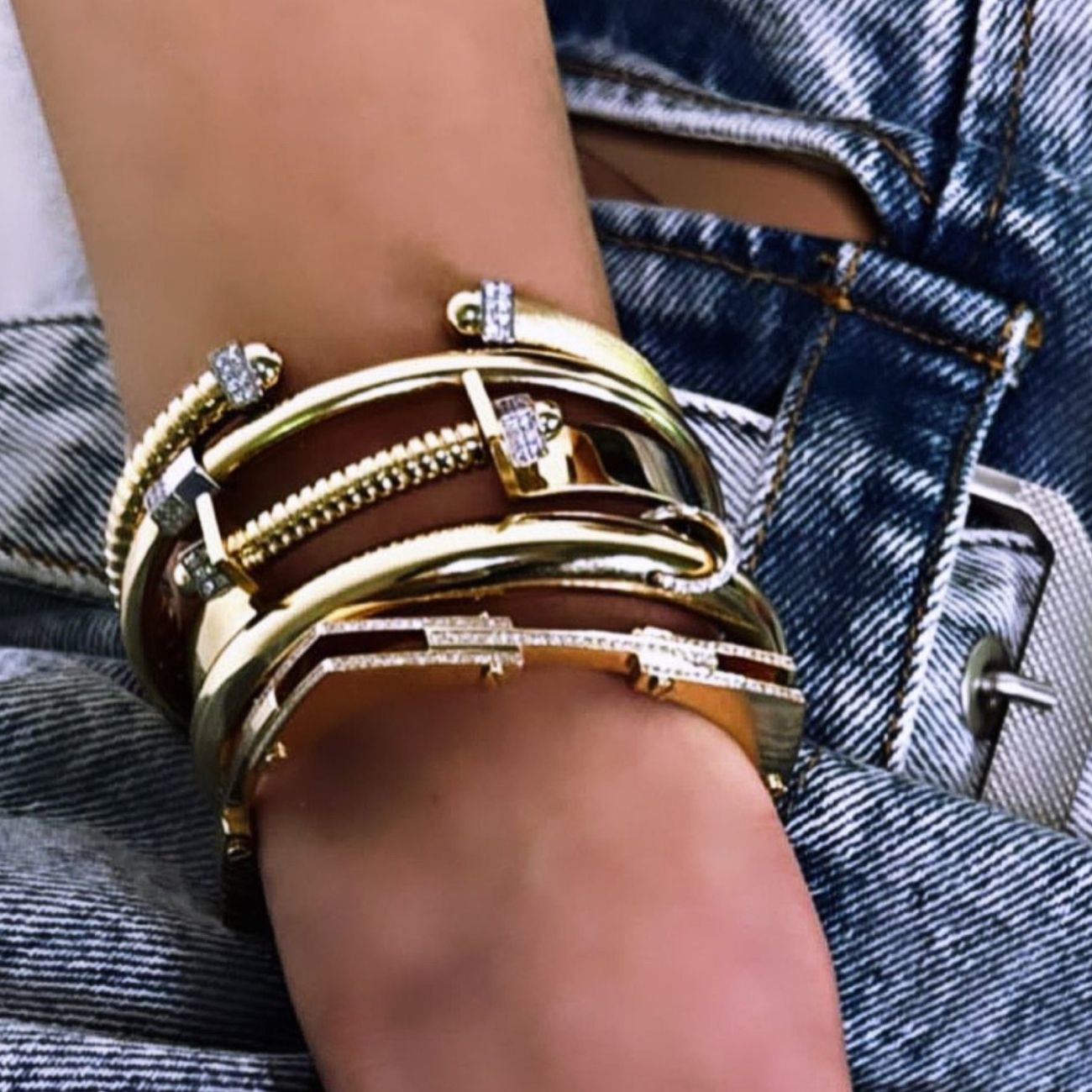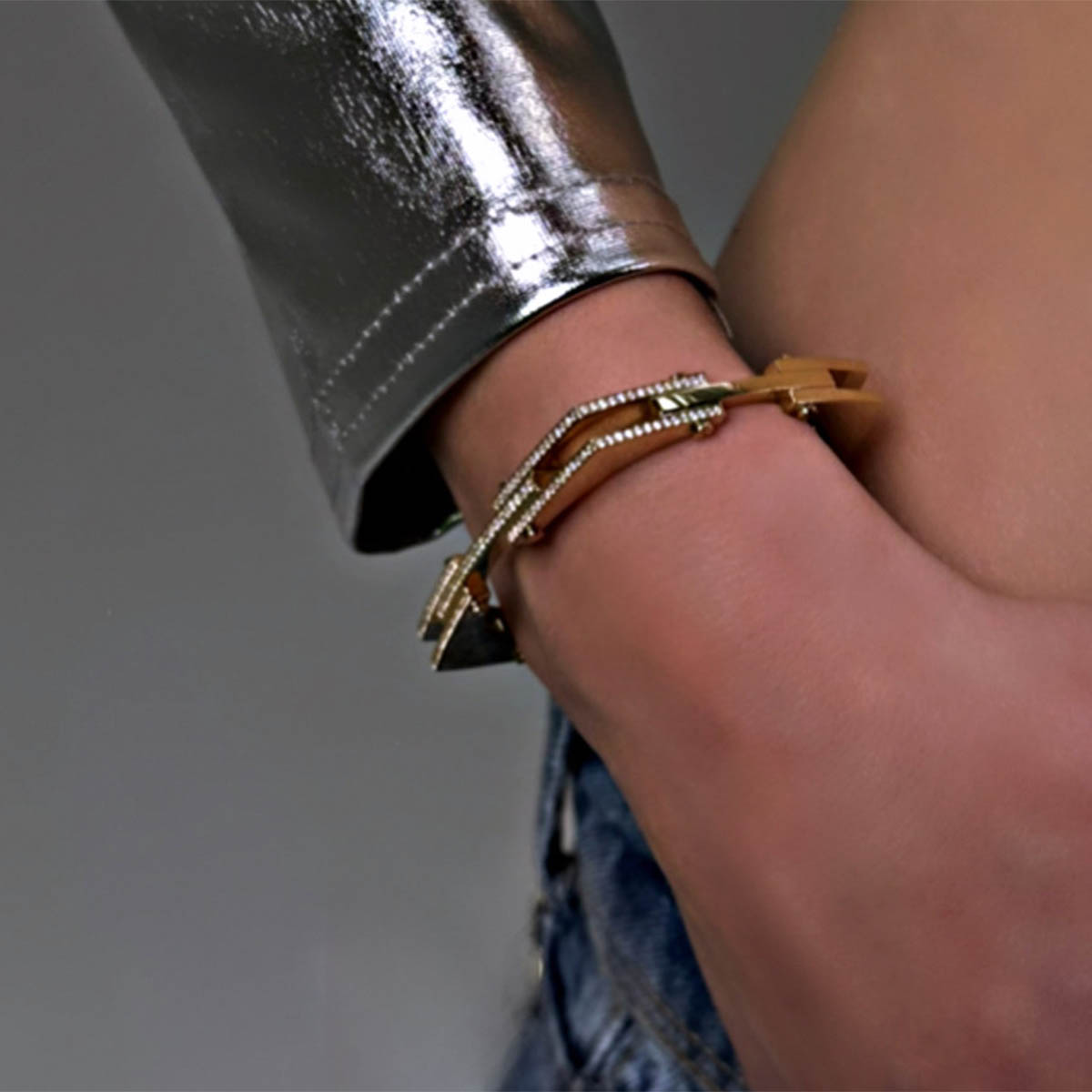 Rainbow K’s jewelry is distinguished by its modernity and originality, which is why its pieces are particularly geometrical and sculptural. The “Chrome” bangle will structurate and finish your look with a rock touch.