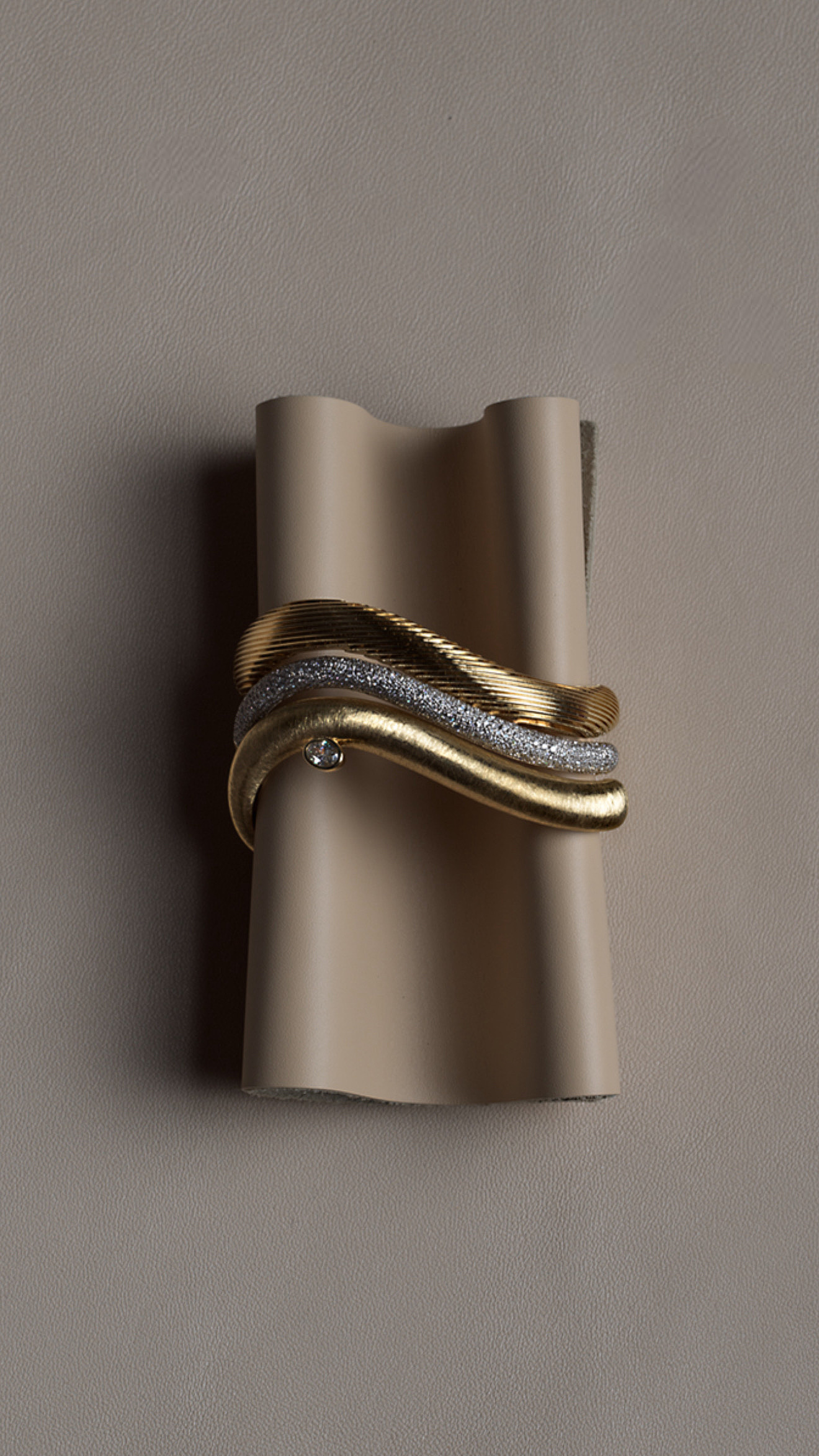 The Illusion Bangle striated explores the power of couture stacking: sculptural volumes, contrasting textures, and a mastery of light that creates a dialogue between shadow and brilliance.