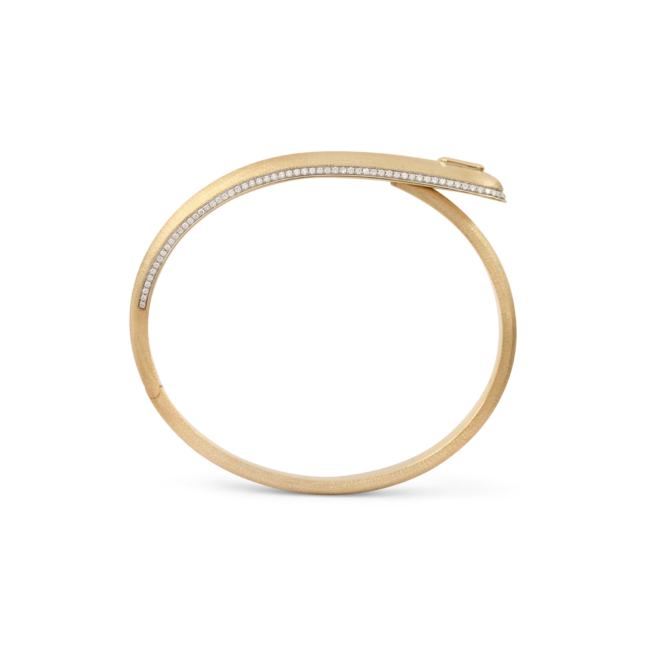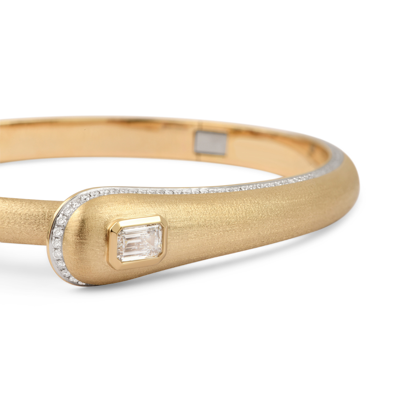 Let yourself be seduced by the timeless elegance of Prestige bangle in brushed gold, delicately paved with diamonds and sublimated by a diamond pear, emerald or heart. A symbol of elegance glamour and refinement to wear on any occasion.