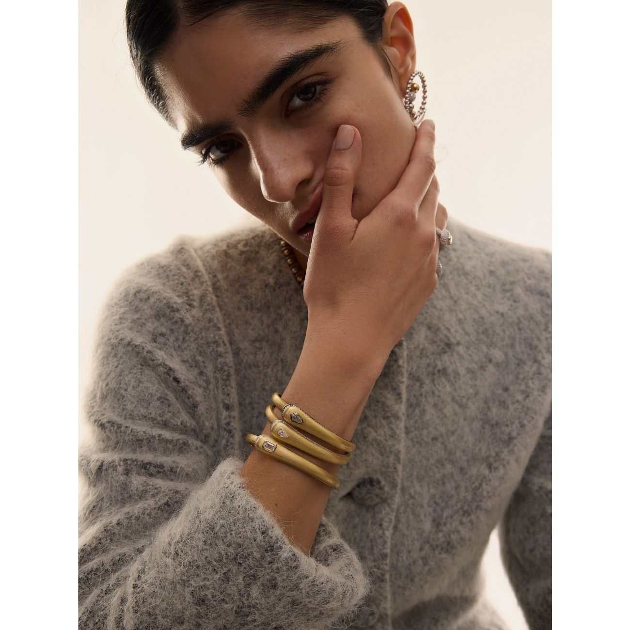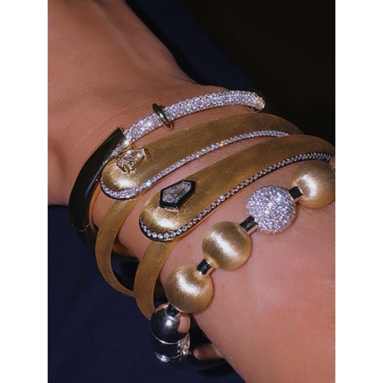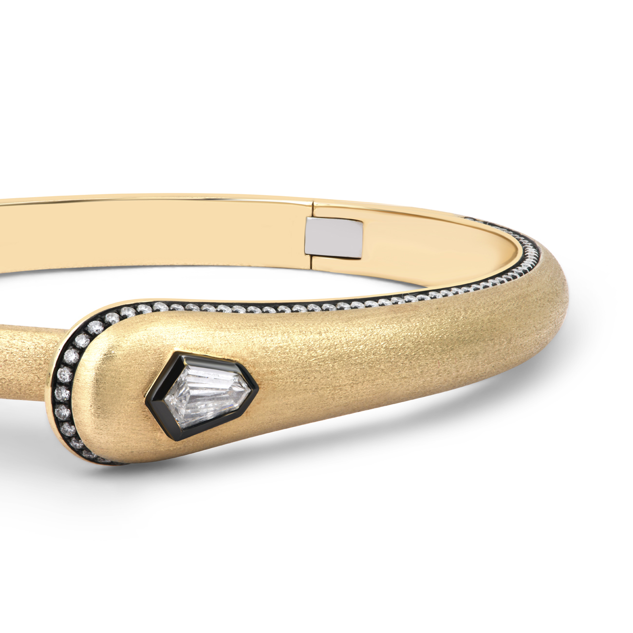 Let yourself be seduced by the timeless elegance of Prestige bangle in brushed gold, delicately paved with diamonds and sublimated by a diamond pear, emerald or heart. A symbol of elegance glamour and refinement to wear on any occasion.