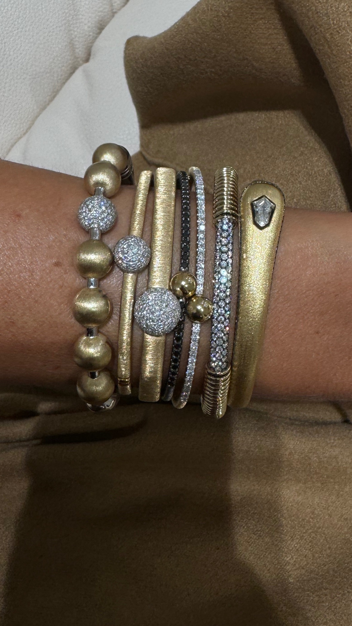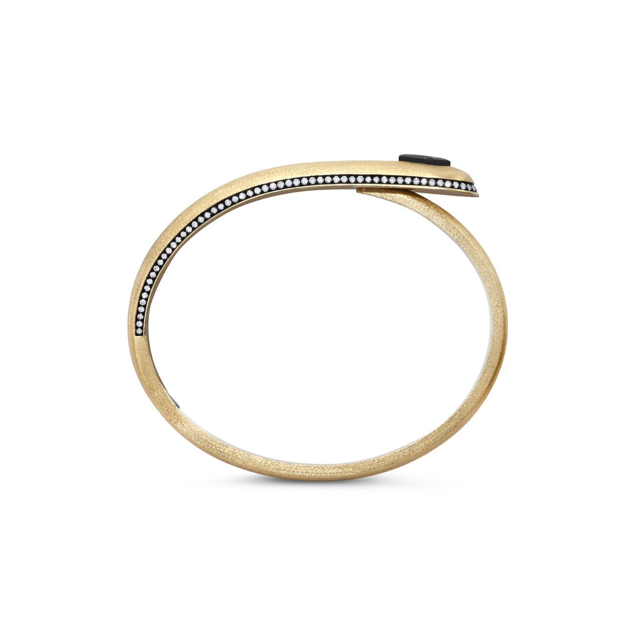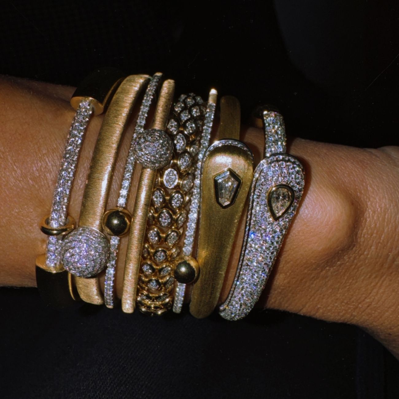 Let yourself be seduced by the timeless elegance of Prestige bangle in brushed gold, delicately paved with diamonds and sublimated by a diamond pear, emerald or heart. A symbol of elegance glamour and refinement to wear on any occasion.