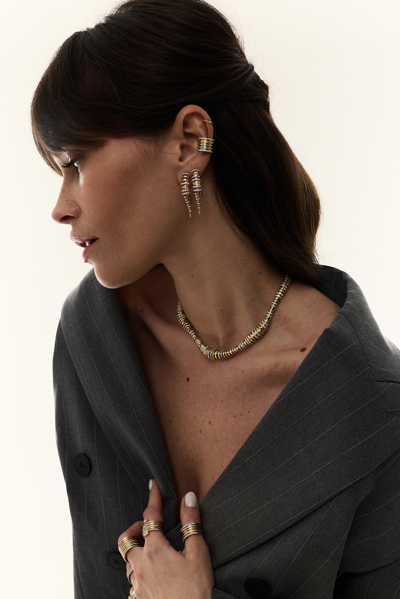 An inspiration for the TOURBILLON earcuff. A piece sculpted like a movement, both architectural and fluidly hypnotic. A geometric fine jewelry line shaped by elegant curves, blending the radiance of gold, the purity of diamonds, and the precision of baguette settings.