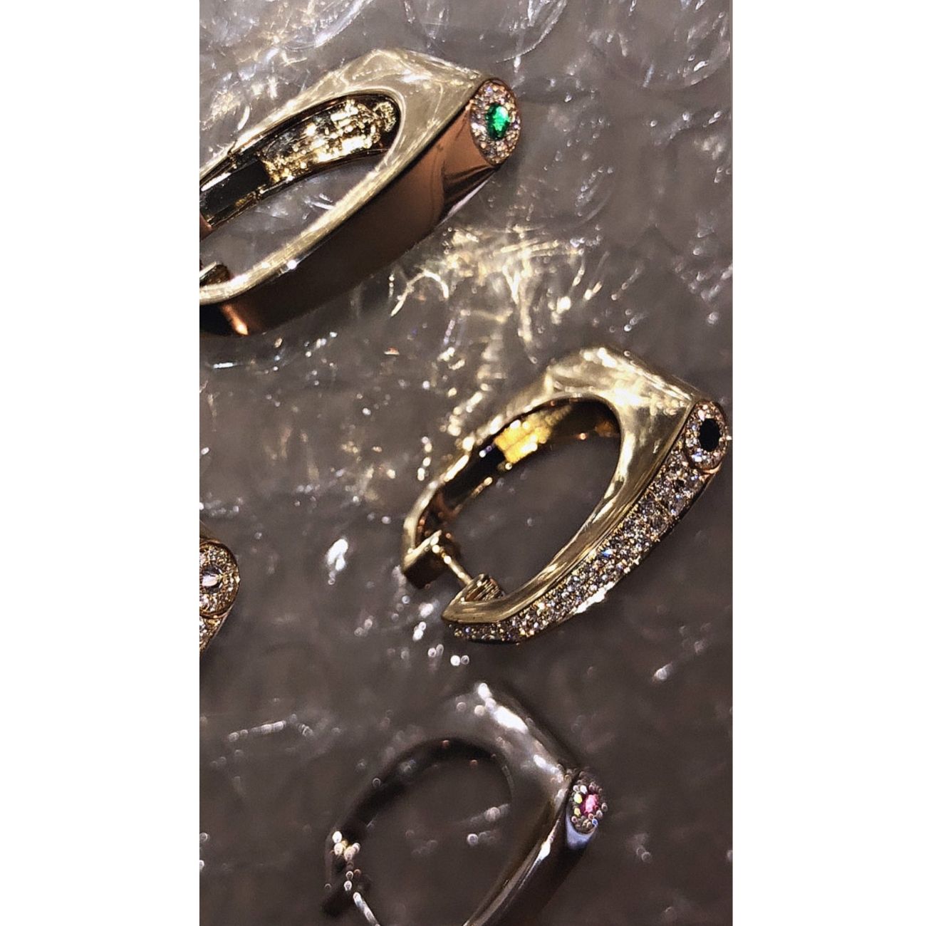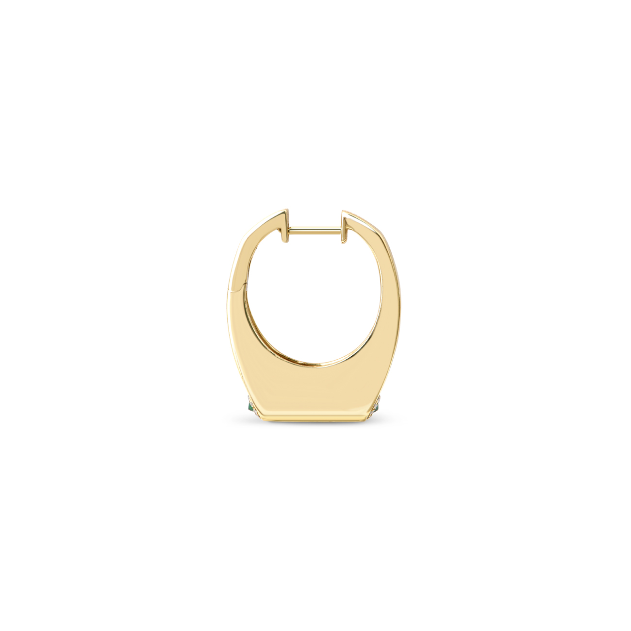Rainbow K’s stunning collections are inspired by vintage jewelry and Art Deco aesthetics. This unique earring is crafted in sparkling 14K gold and encrusted with a set of sparkling diamonds. It is equipped with two emeralds, set on either side of its base, for a remarkable effect whatever the angle from which it is viewed.