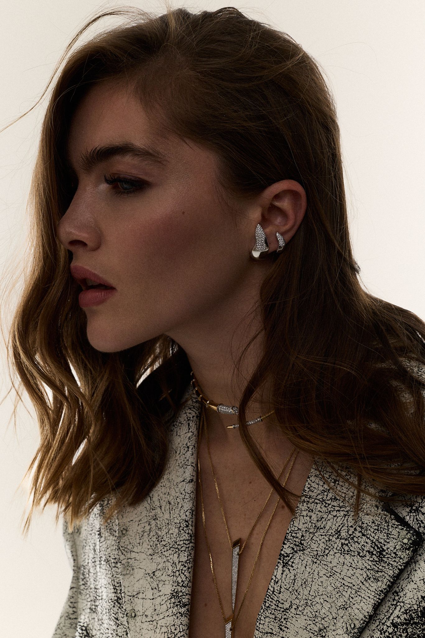 The “Shark” earring is for those looking for a unique piece of jewelry that combines the raw beauty of nature with the elegance of jewelry making. It can be worn alone for a bold, minimalist look, or paired with other Rainbow K jewelry.