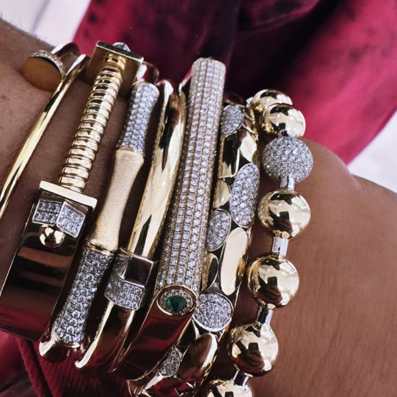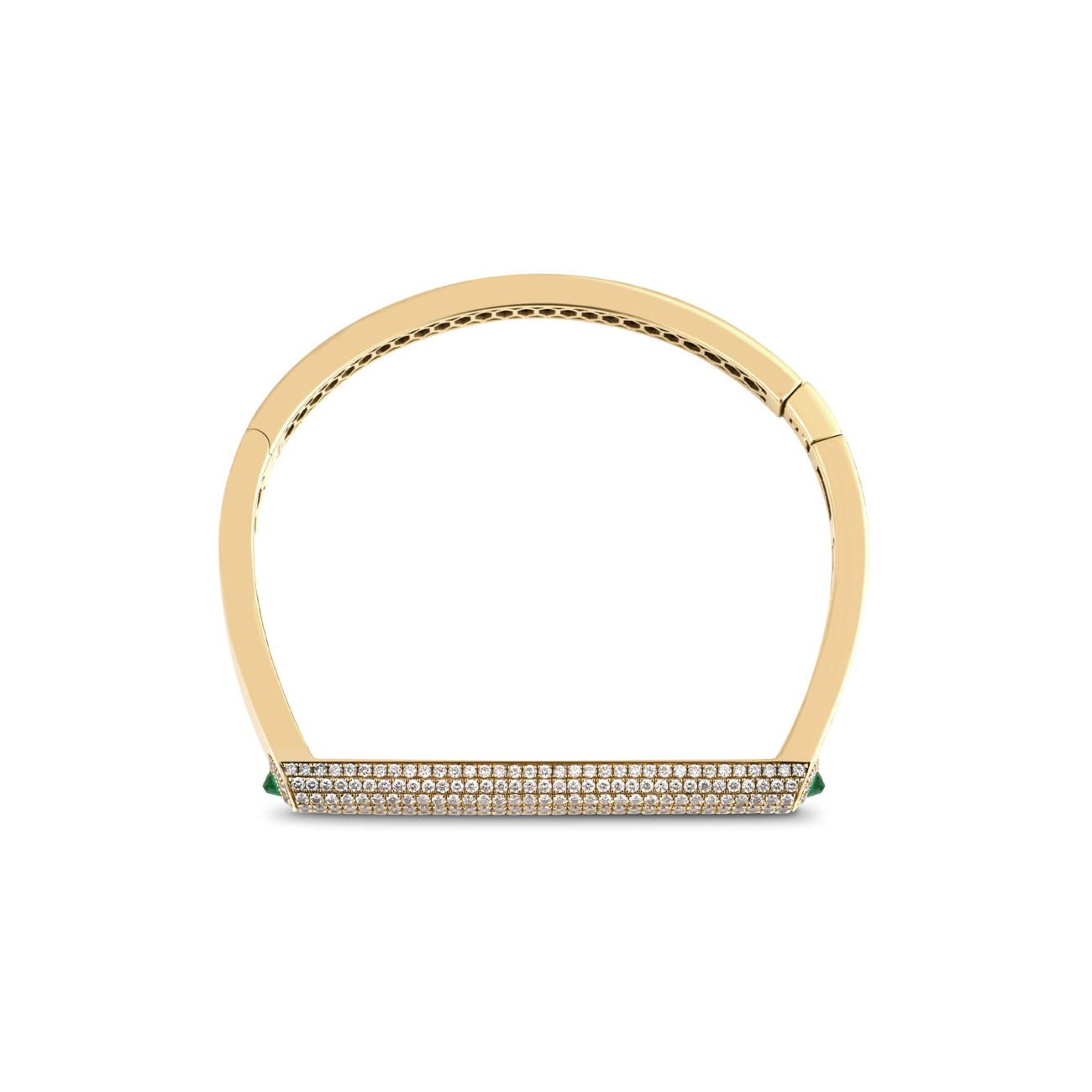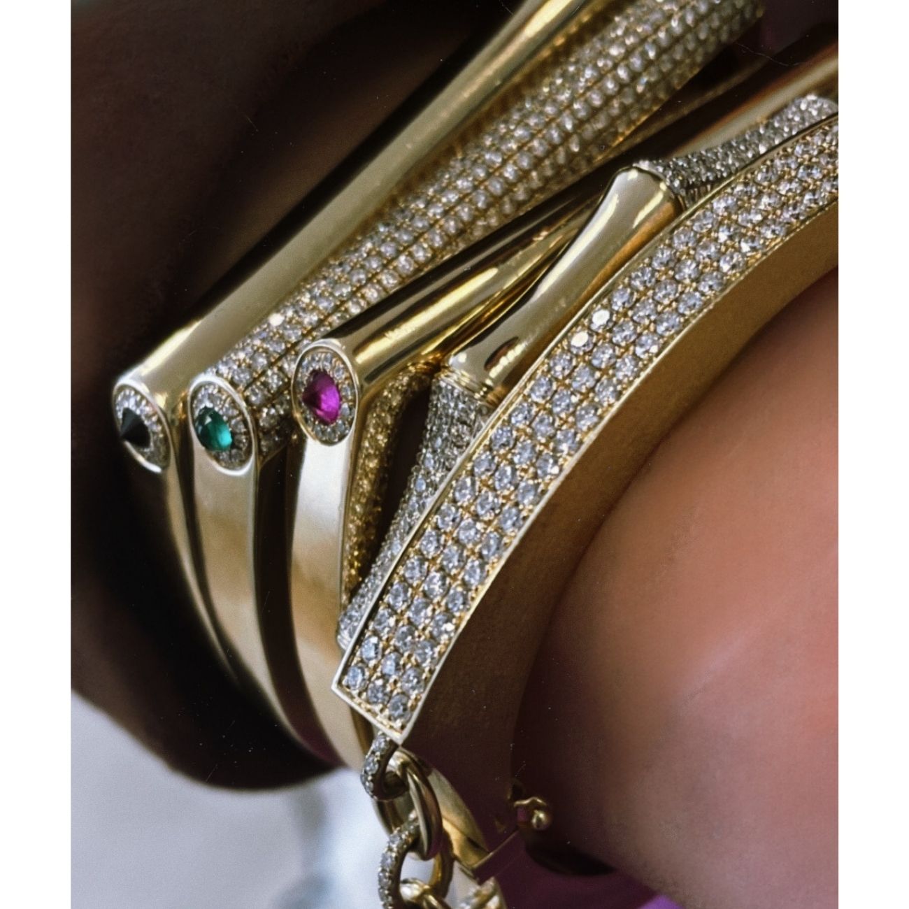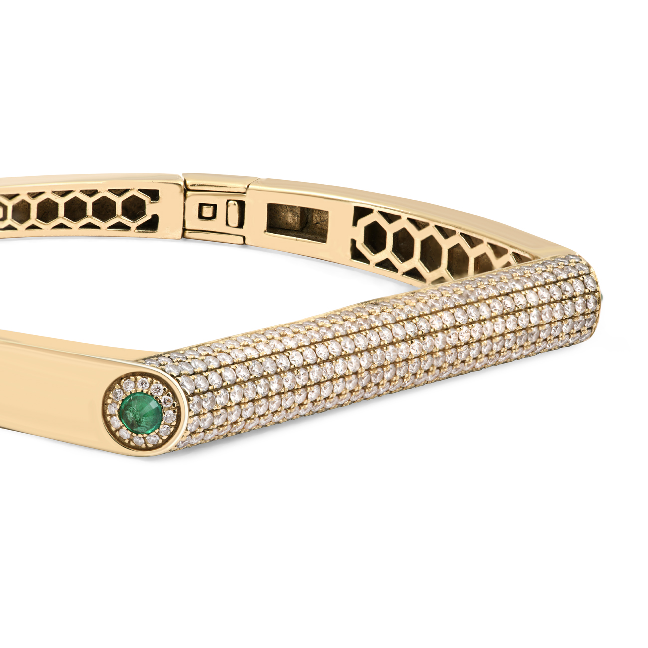 Urn to Rainbow K for statement-making pieces like the Grace bangle. Made from 14kt yellow gold with pavé-set diamonds and point-cut emeralds, this structured design will bring some dazzle to any ensemble.