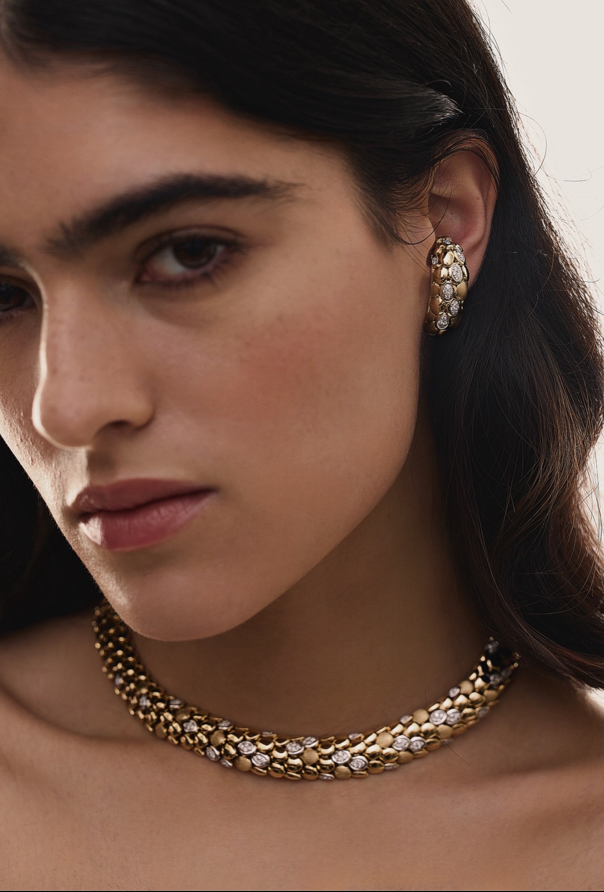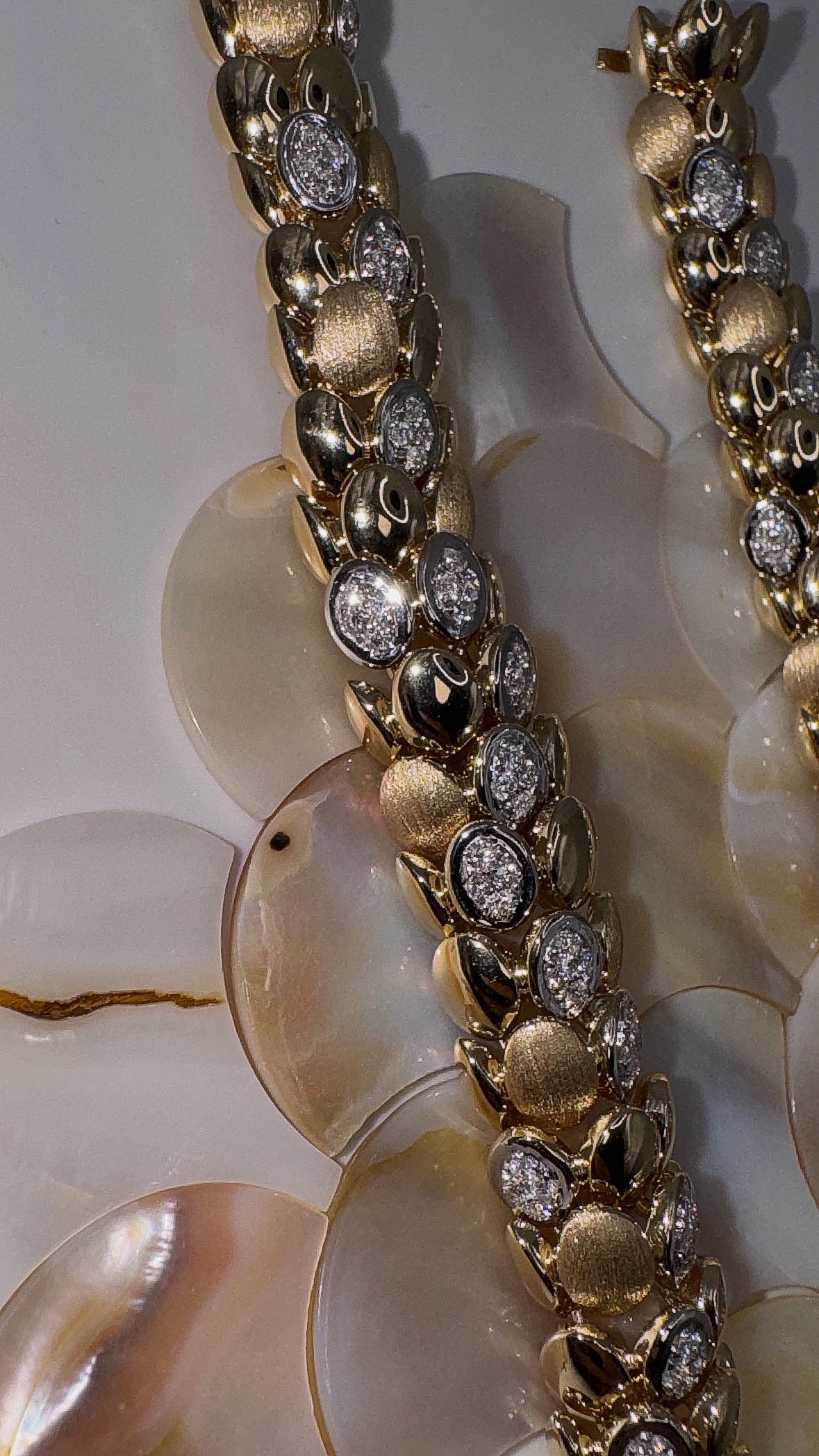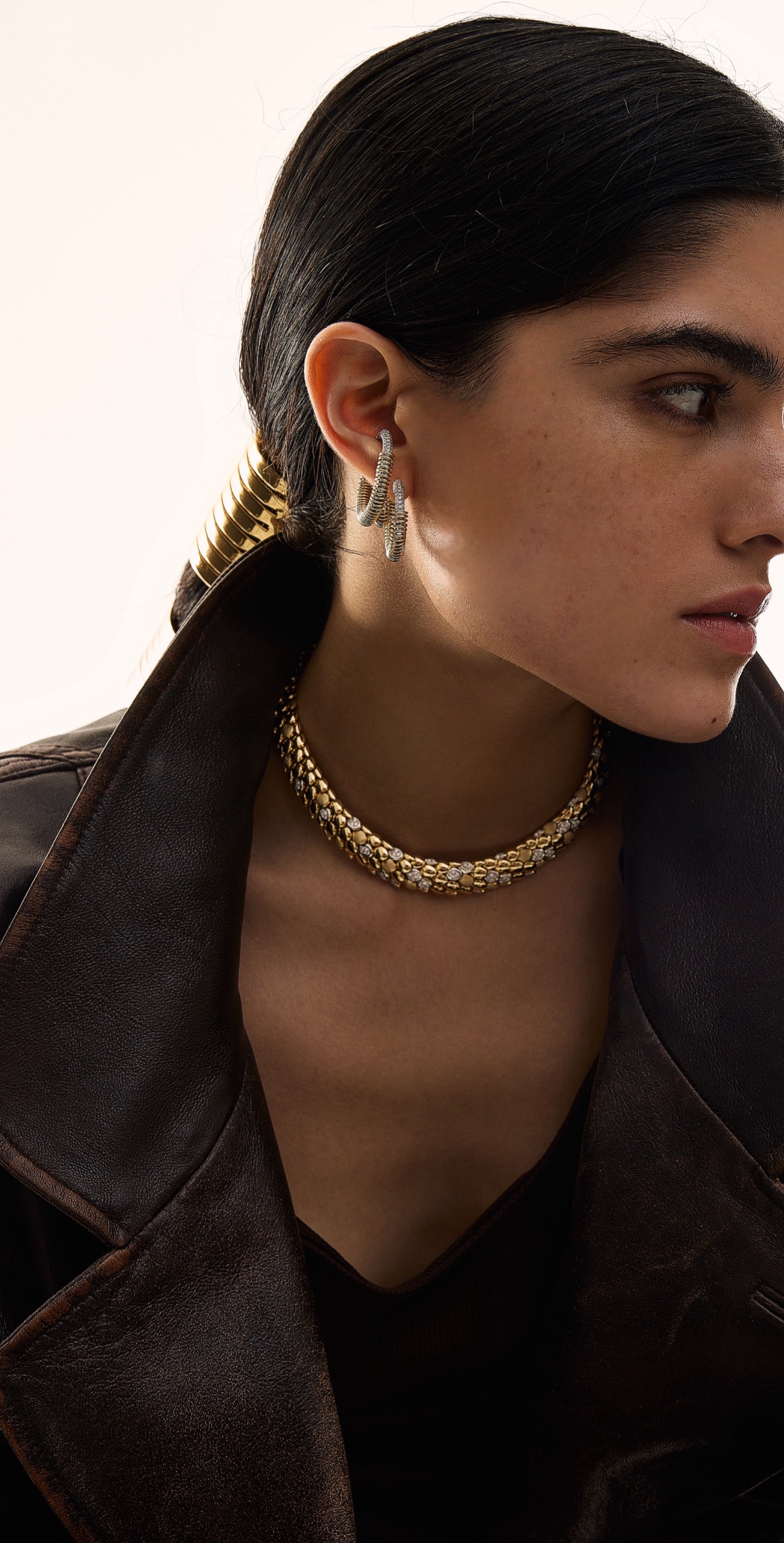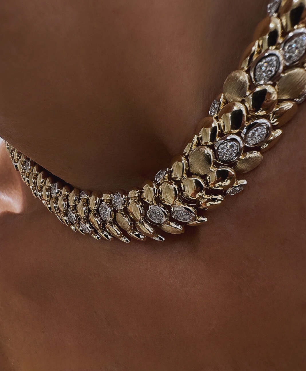 The Blossom necklace with delicate petals carefully articulated for a fluid and elegant movement, where brushed gold blends with smooth gold to create a perfect harmony. Let your inner sparkle shine with this exceptional piece.