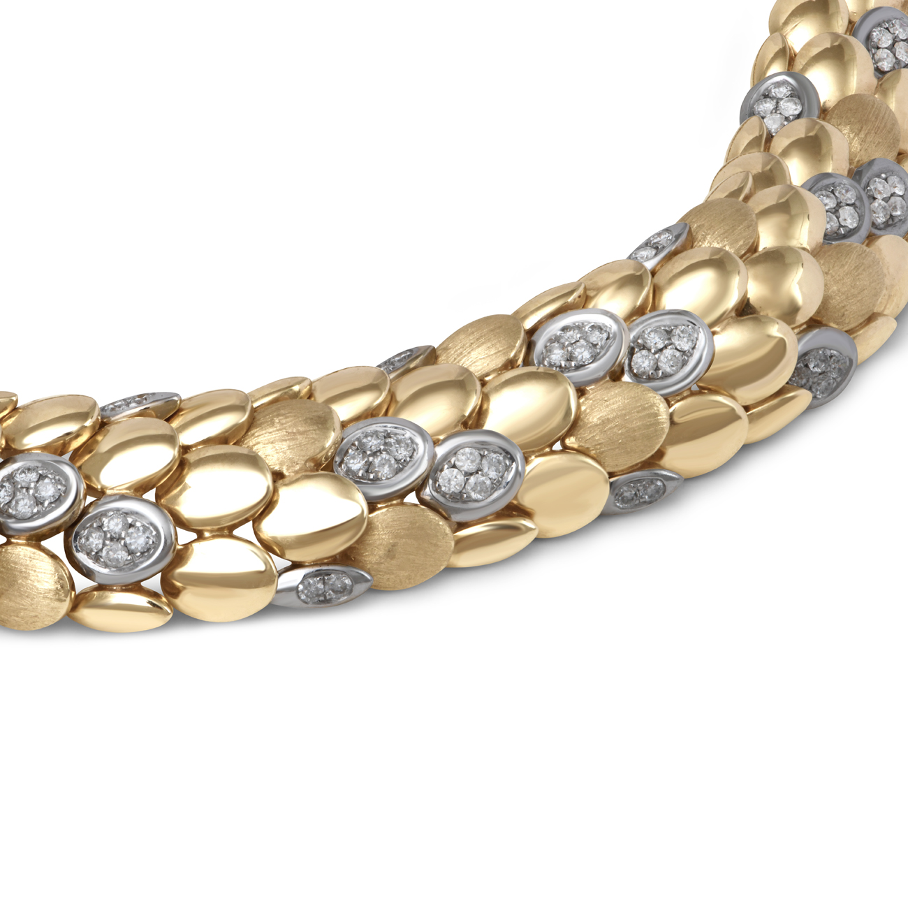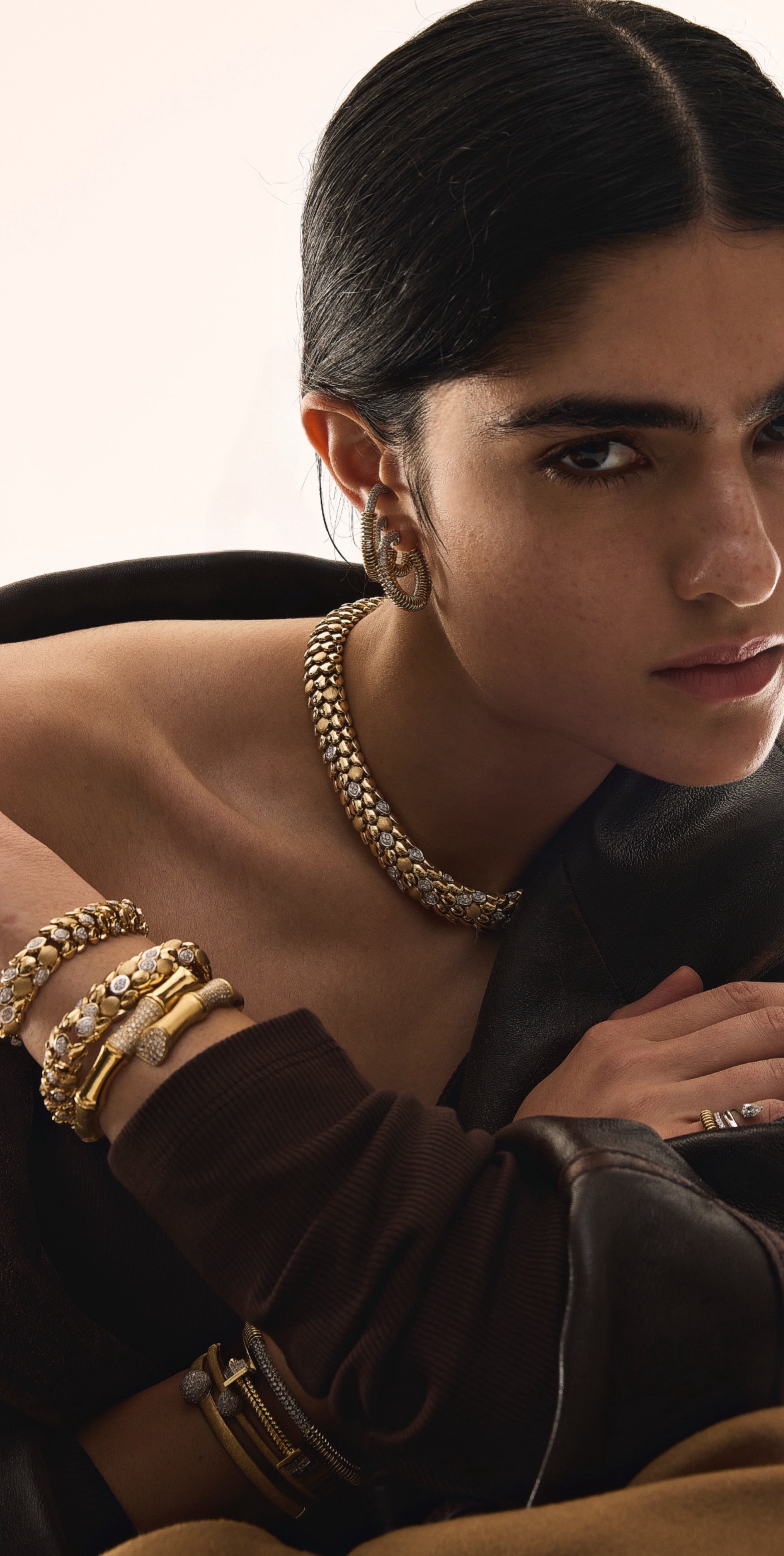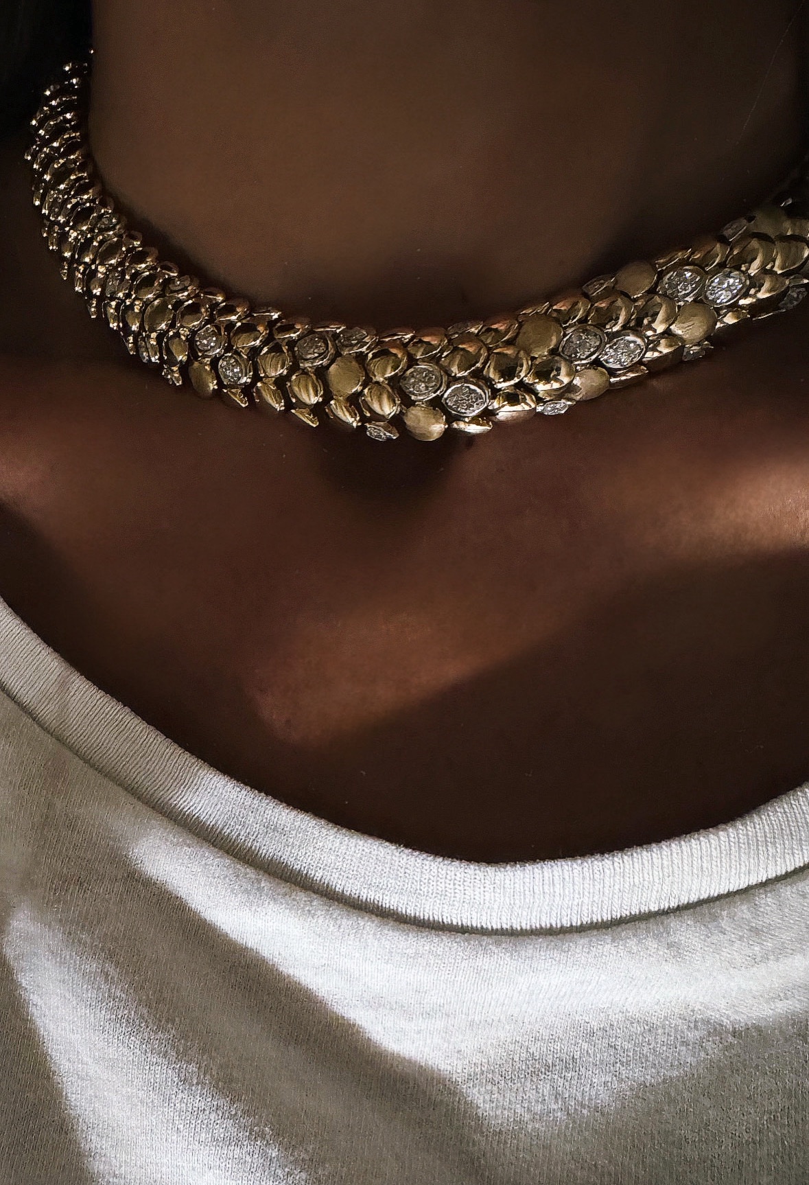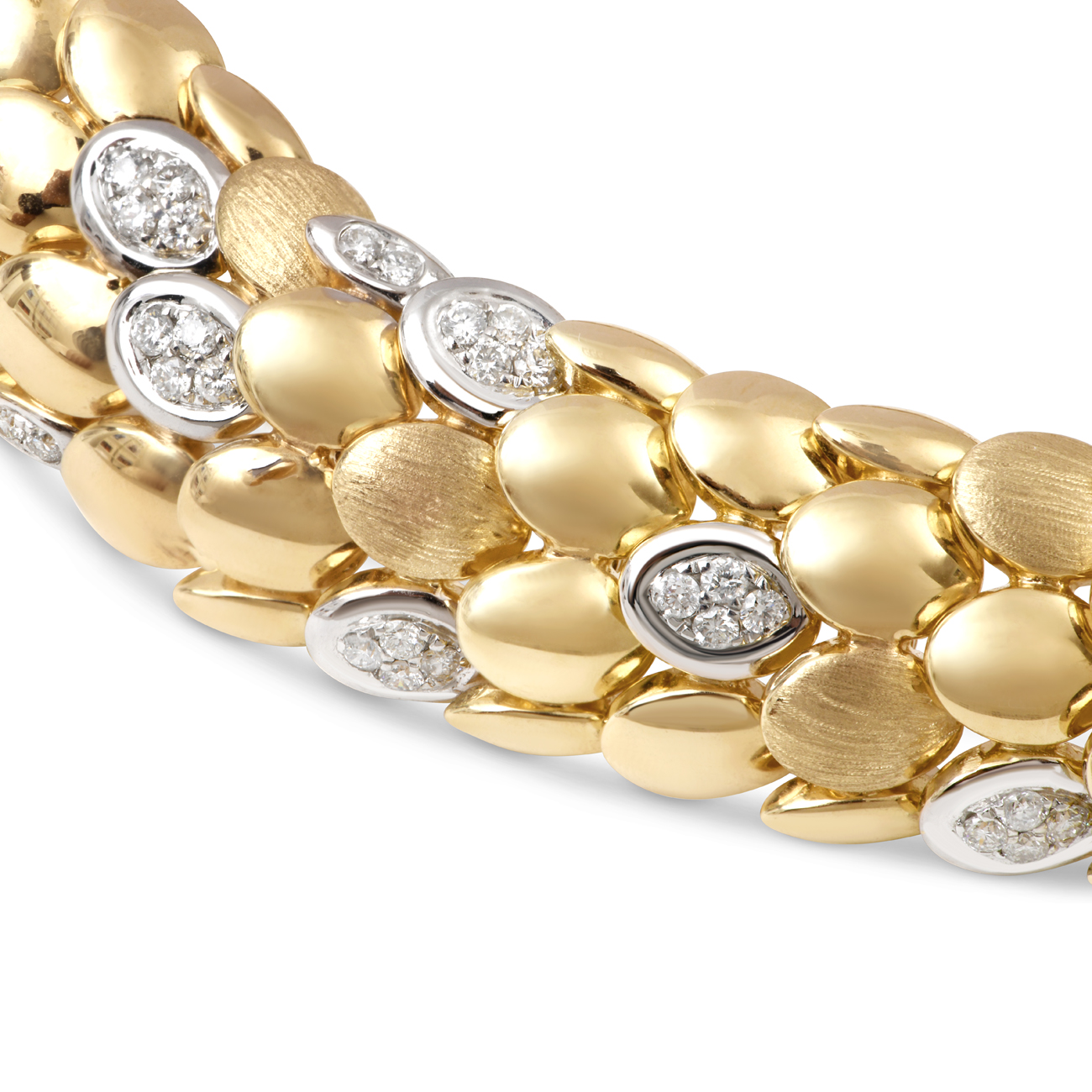 The Blossom necklace with delicate petals carefully articulated for a fluid and elegant movement, where brushed gold blends with smooth gold to create a perfect harmony. Let your inner sparkle shine with this exceptional piece.