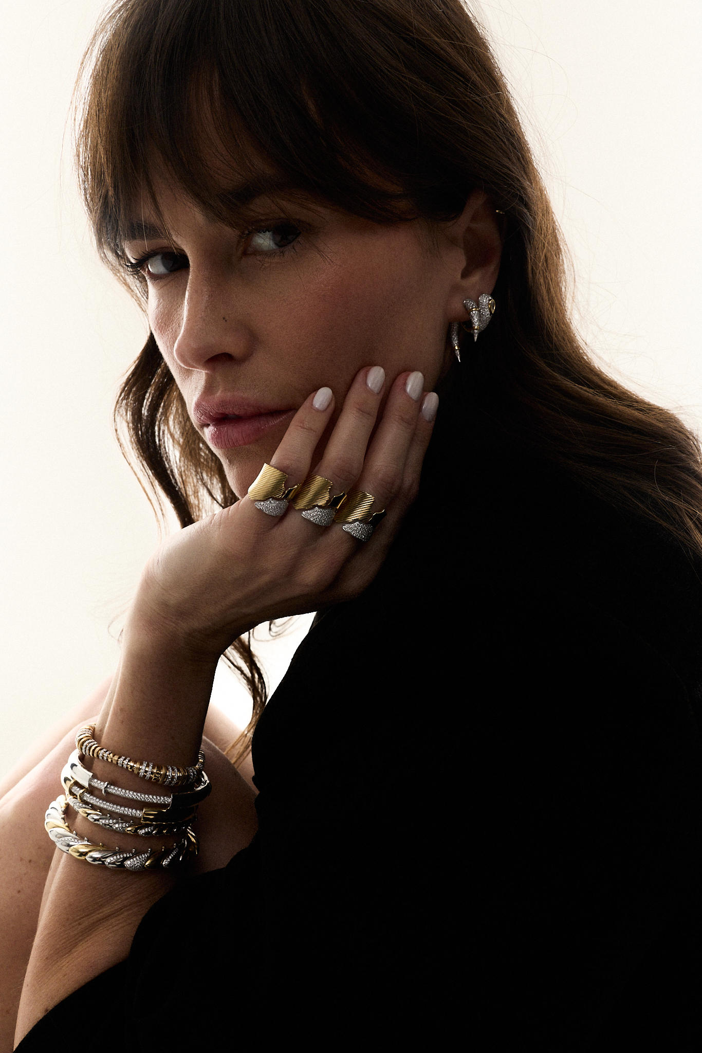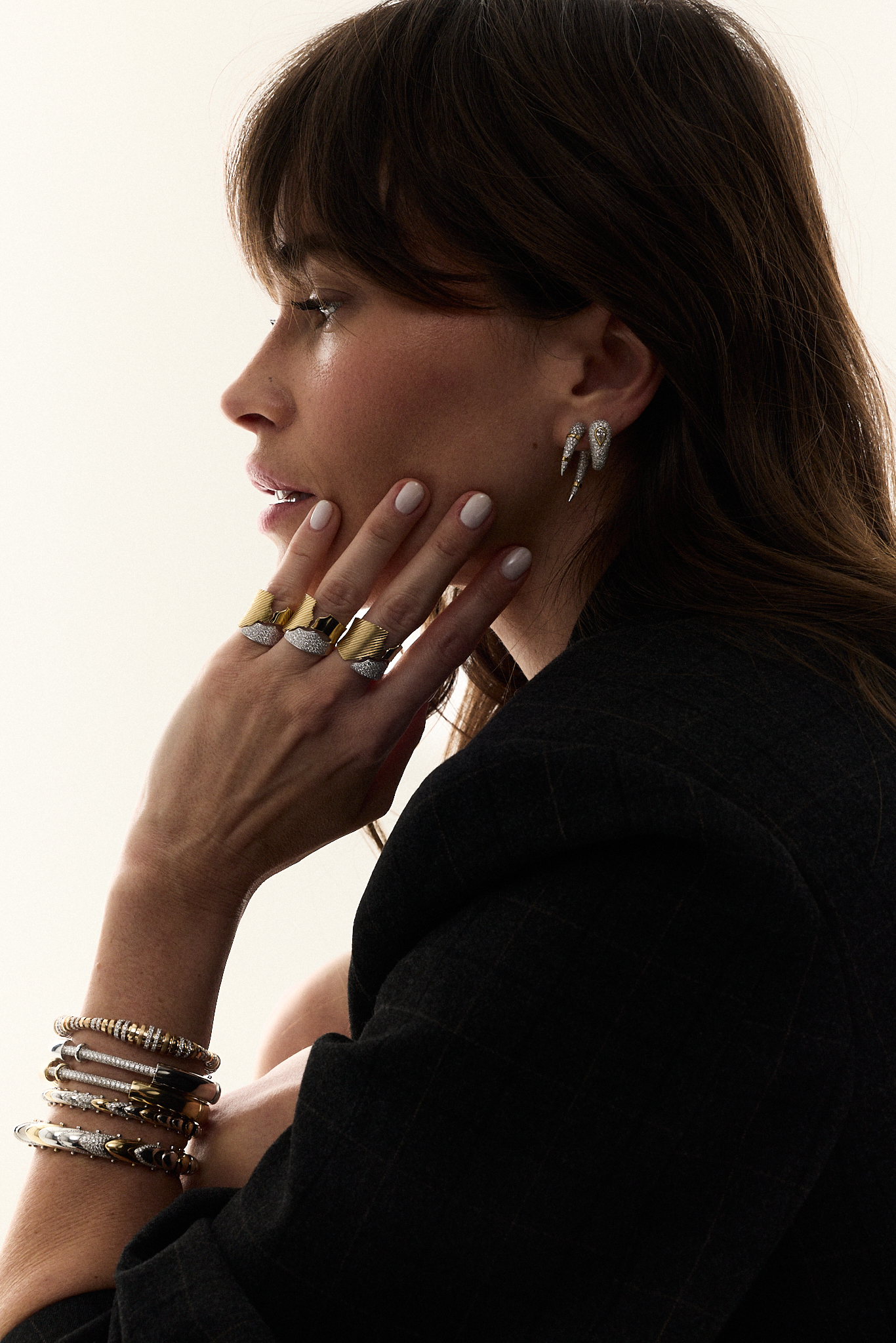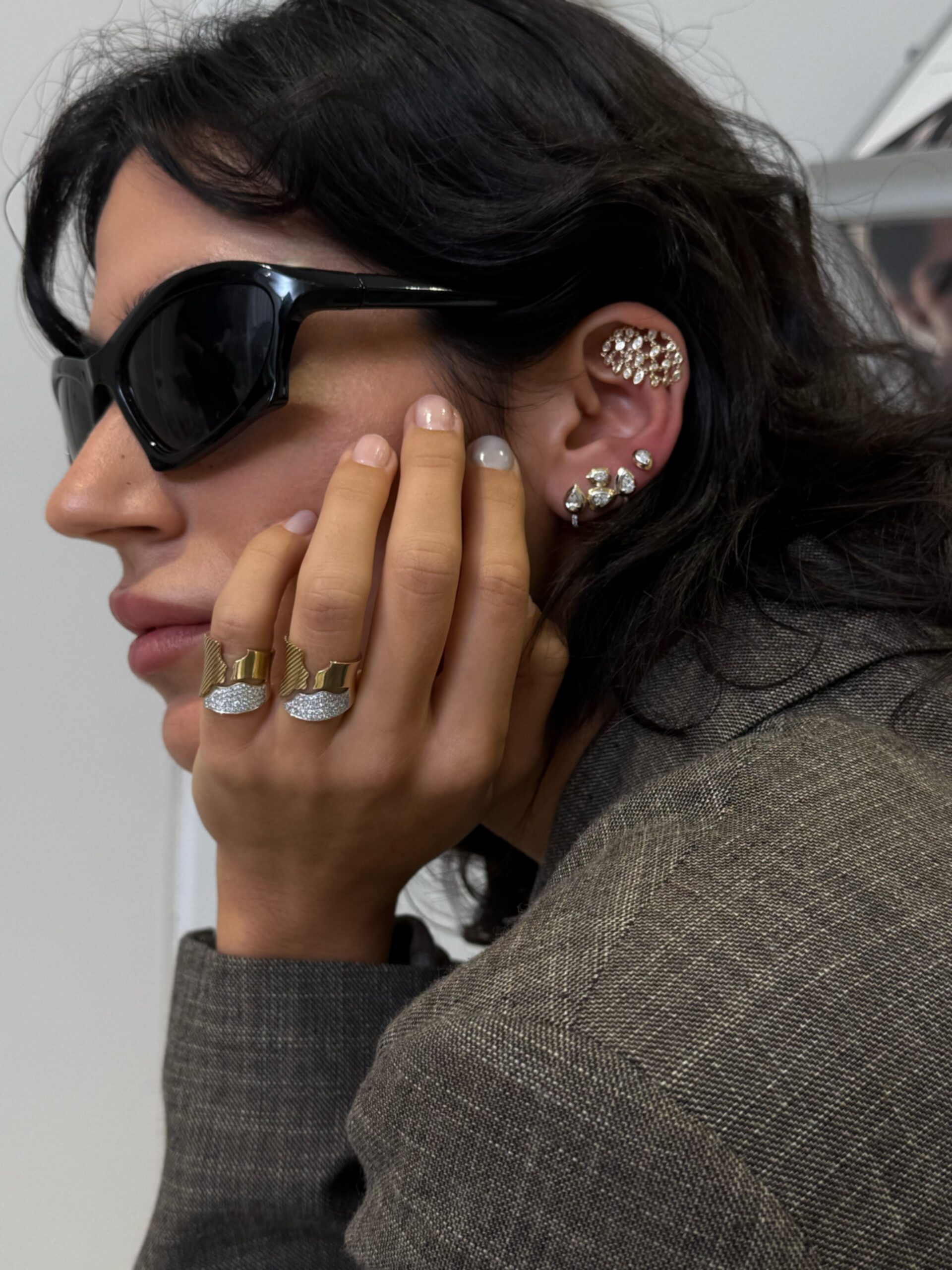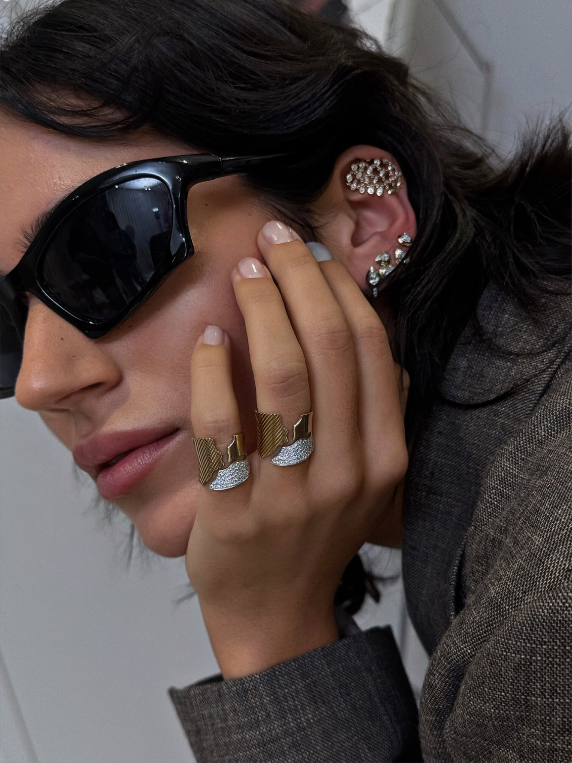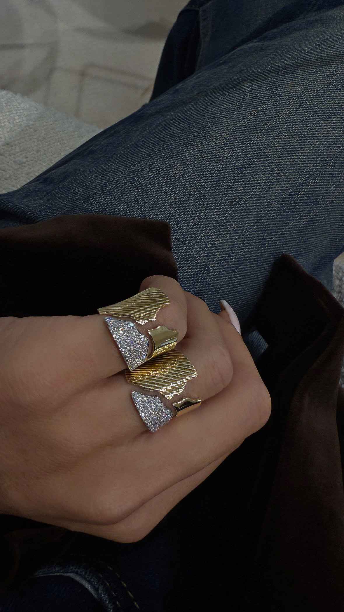 Bold and refined, the Corset Ring beautifully combines smooth gold, textured gold, and the brilliance of diamonds. Its sculptural silhouette evokes the elegance of a corset, embracing the hand with graceful curves and contrasting textures.