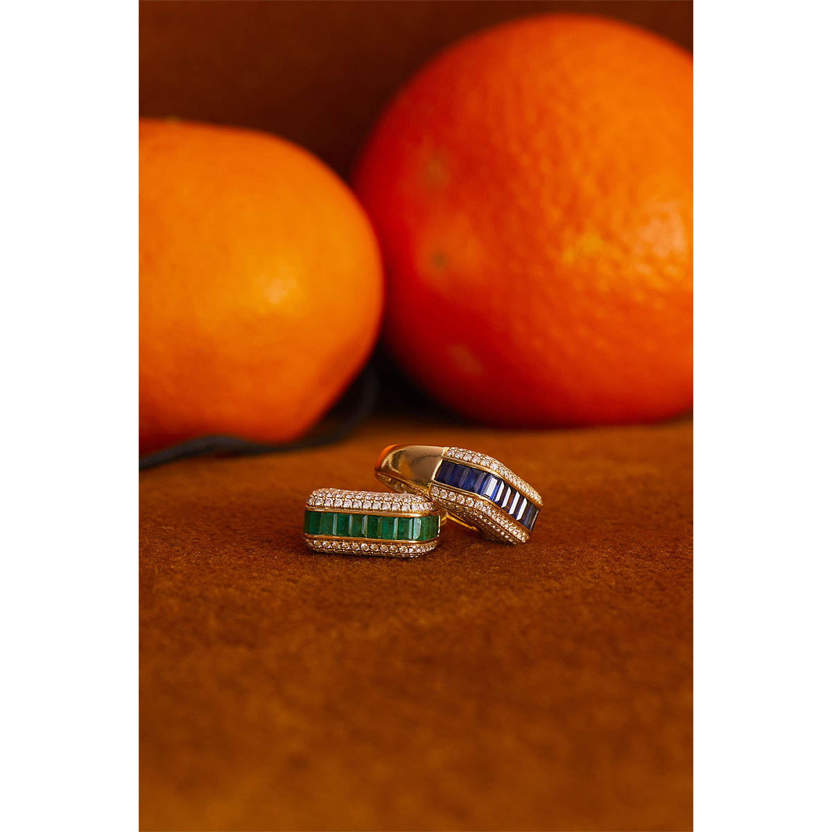 Enhanced with 18K gold, this piece is lavishly decorated with a 2.20 cts channel set gemstone and rows of pave set diamonds. It represents all the codes of the house RK, both high jewelry through the diamond and emeralds while remaining retro in its height.