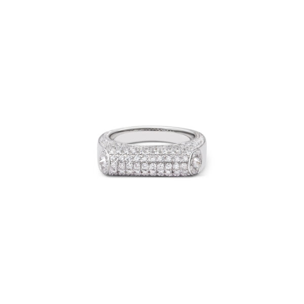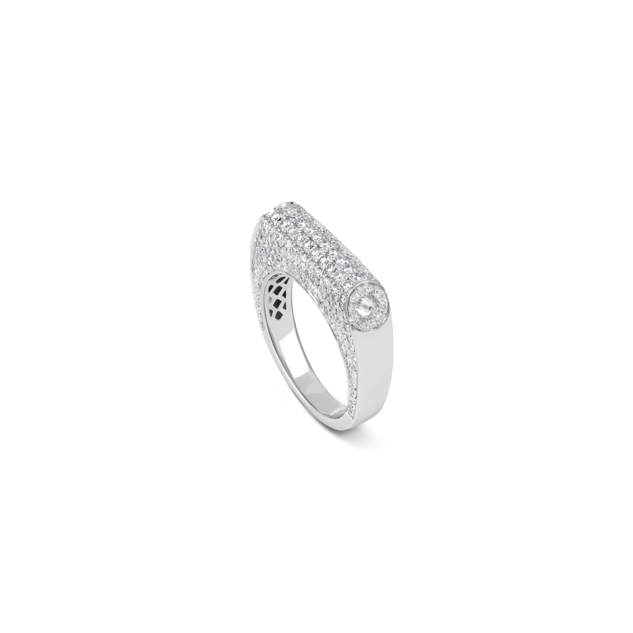Rainbow K’s opulent designs, such as the Grace ring, fuse retro flair with contemporary glamour. This style is made from 14K gold with dazzling pavé-set diamonds and accented with two point-cut Precious Ston