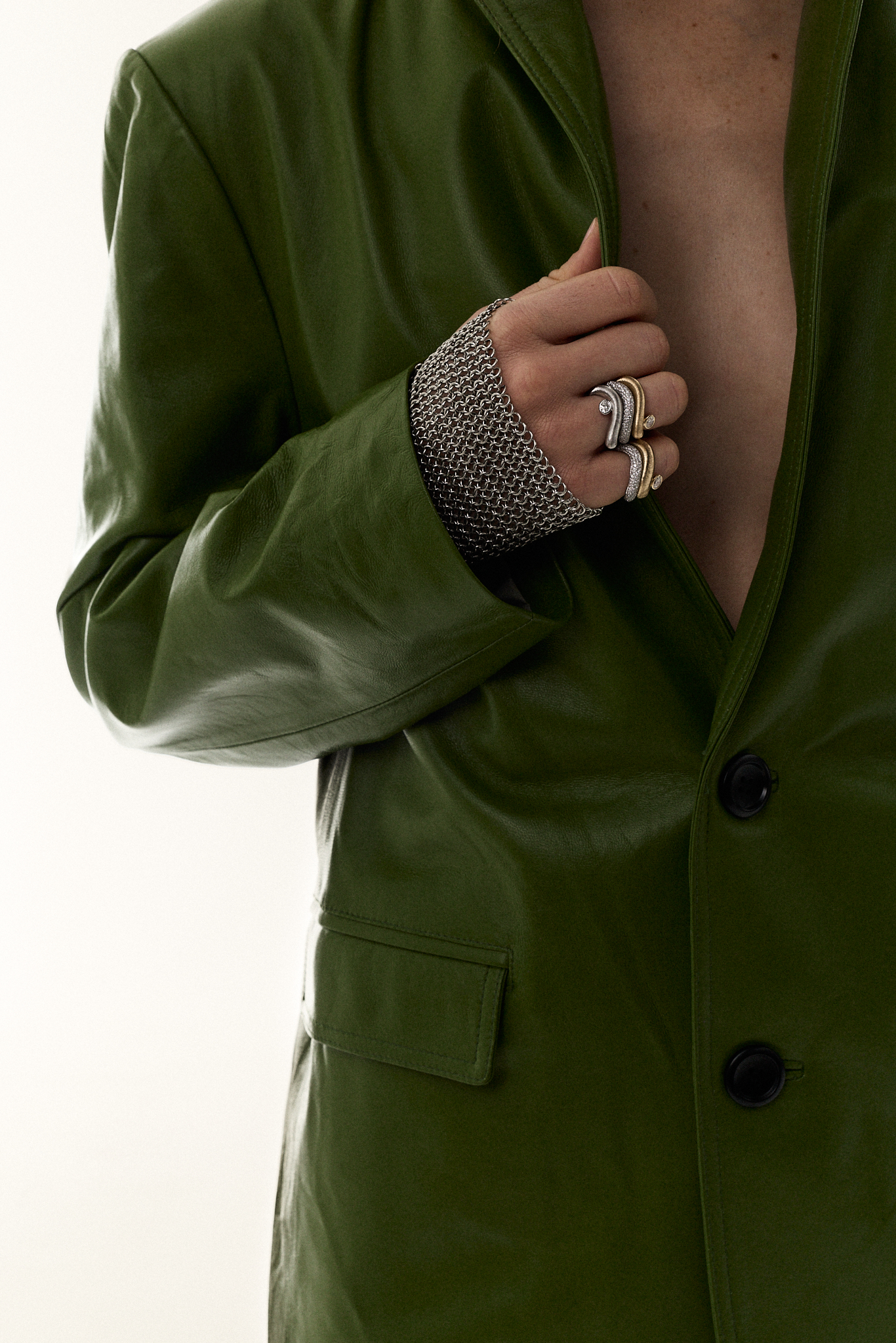 The Illusion ring explores the power of couture stacking: sculptural volumes, contrasting textures, and a mastery of light that creates a dialogue between shadow and brilliance.