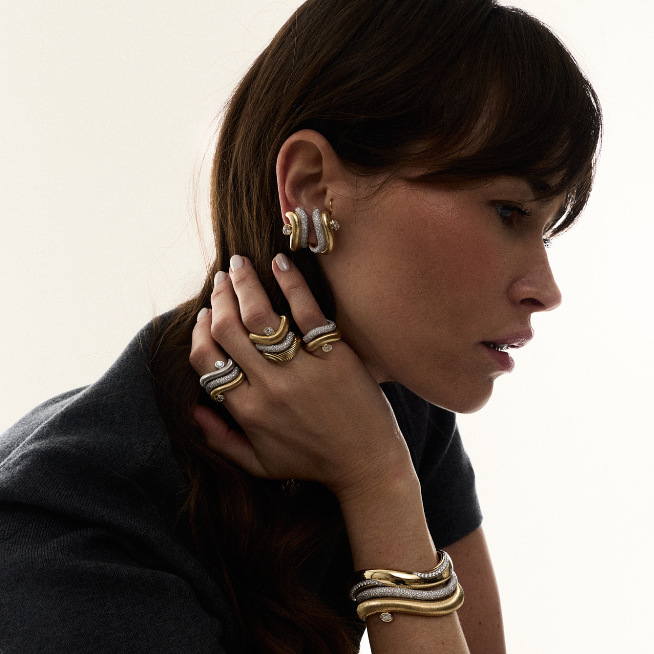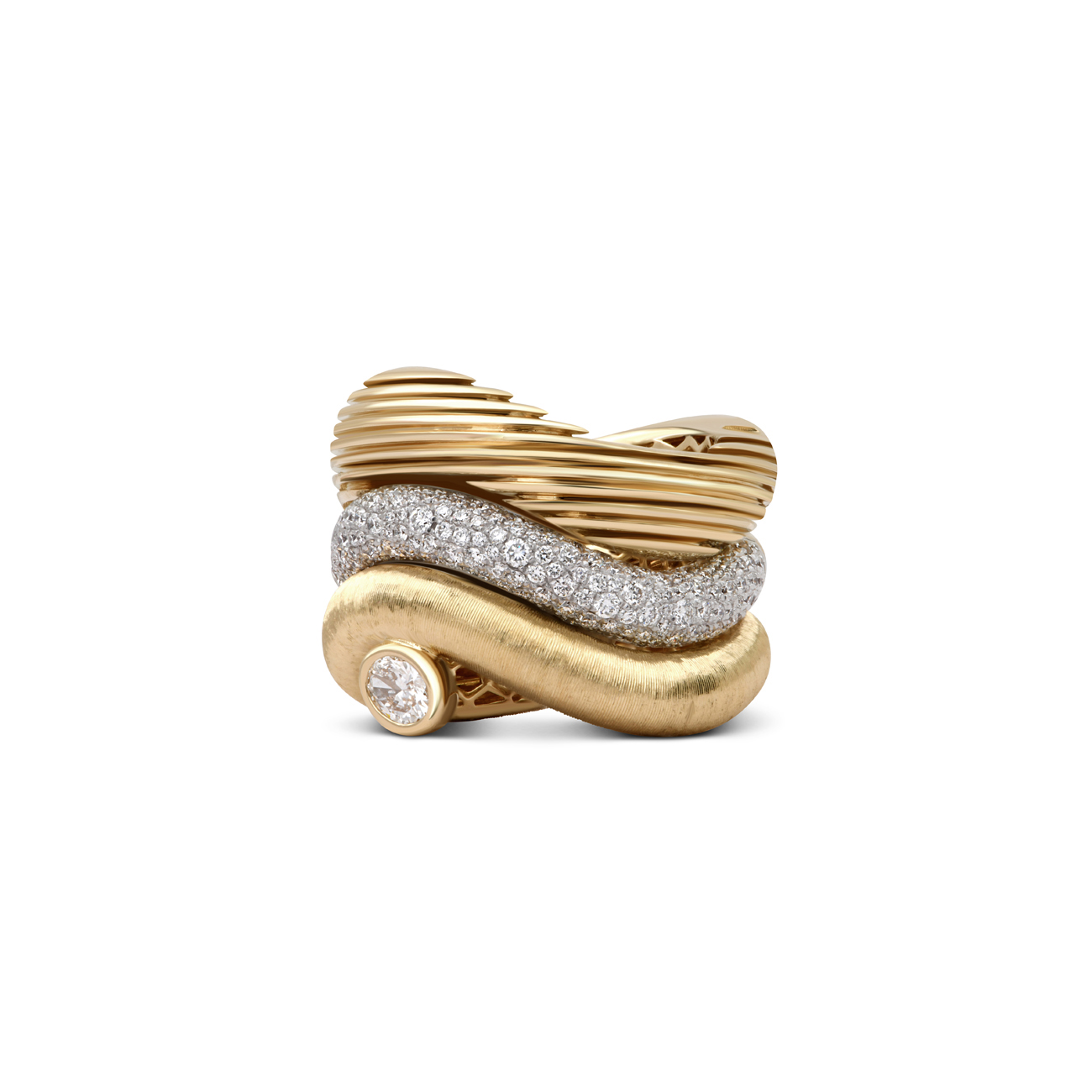 The Illusion ring explores the power of couture stacking: sculptural volumes, contrasting textures, and a mastery of light that creates a dialogue between shadow and brilliance.